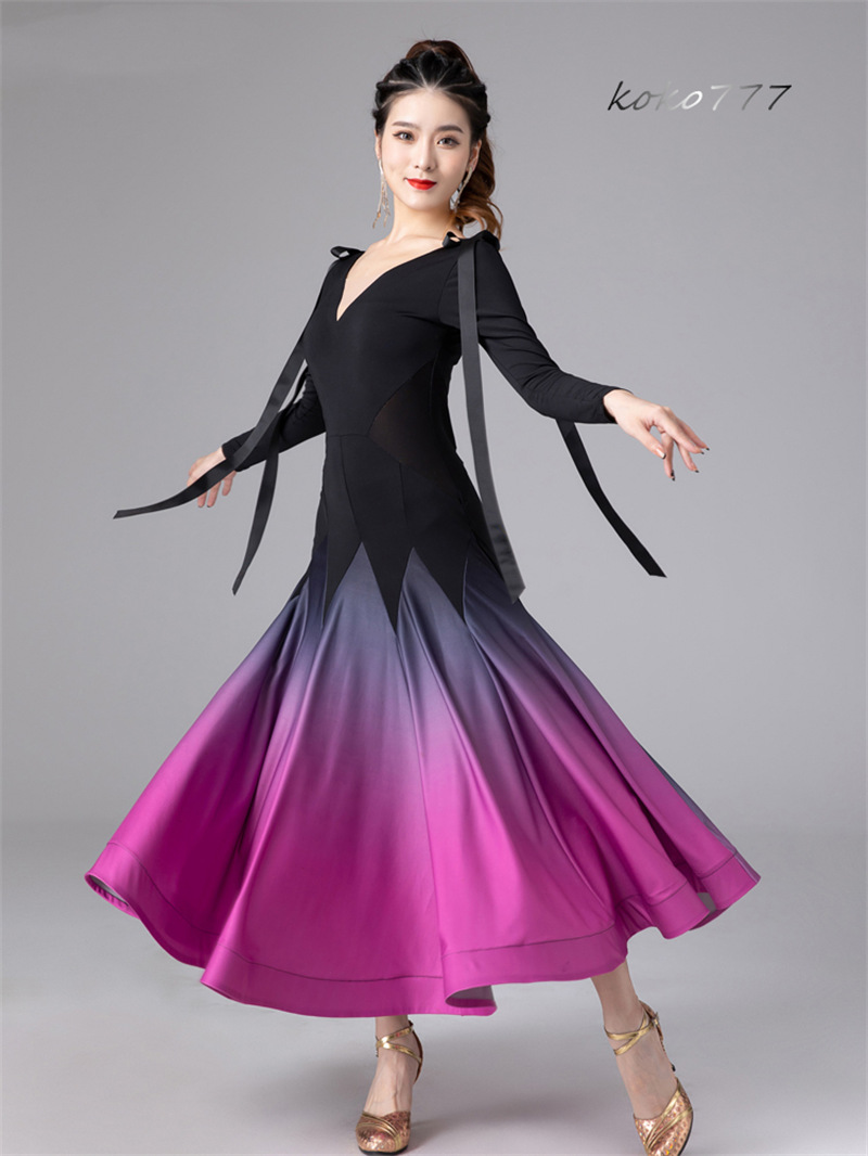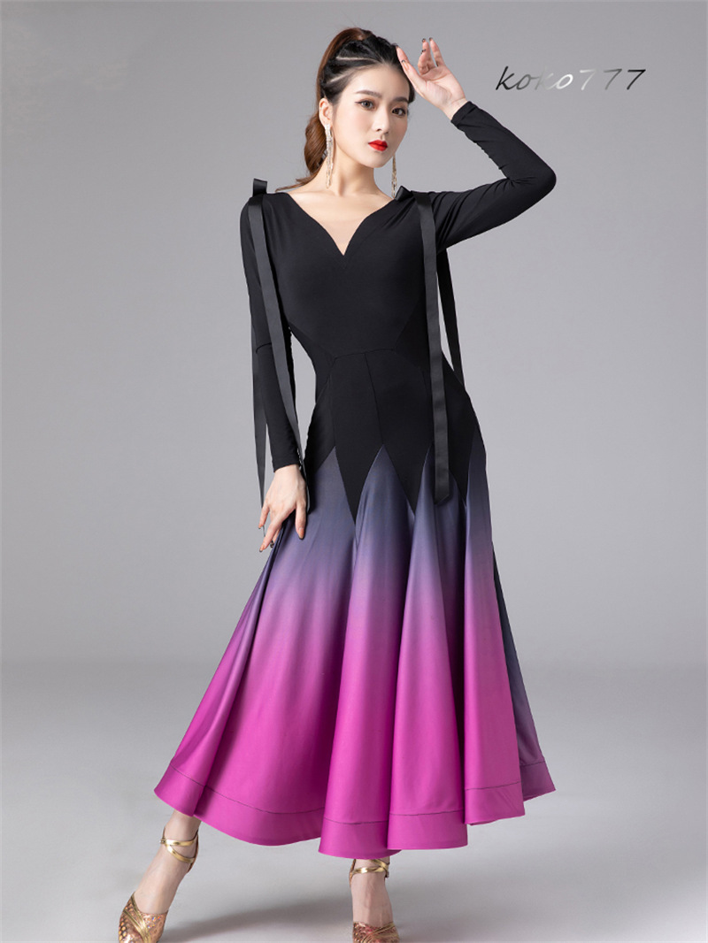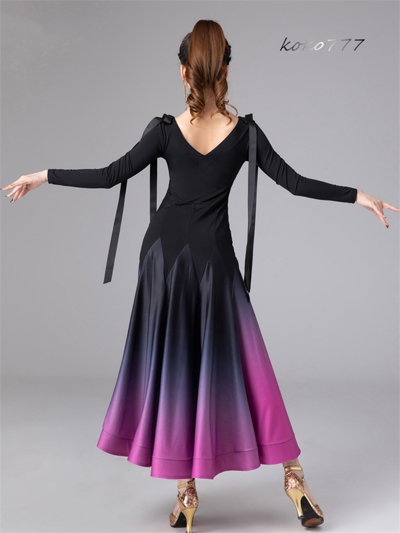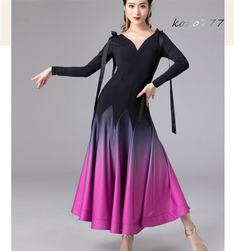 ロングドレス レディース ワンピース ラテンダンス リボン 長袖 グラデーション 発表会 モダンダンス 社交ダンス 公演 ワルツ パーティー 舞台衣装 洋服