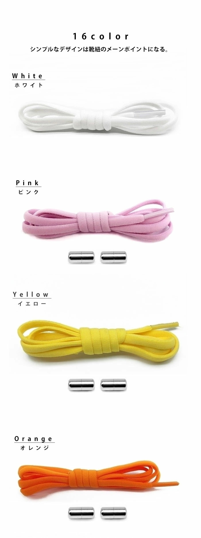 ピンク、イエロー、オレンジ、ホワイト、レッド、パープル、グレー、ネオングリーン、ブラウン、ブラック、カーキベージュ、ライトブルー、ダークブルー、ネイビー、ローズピンク