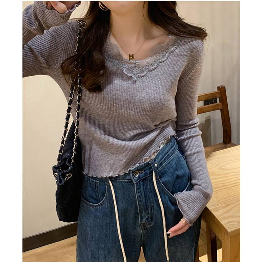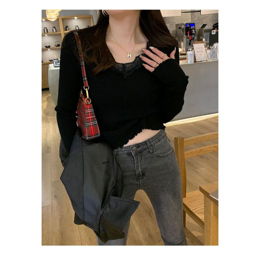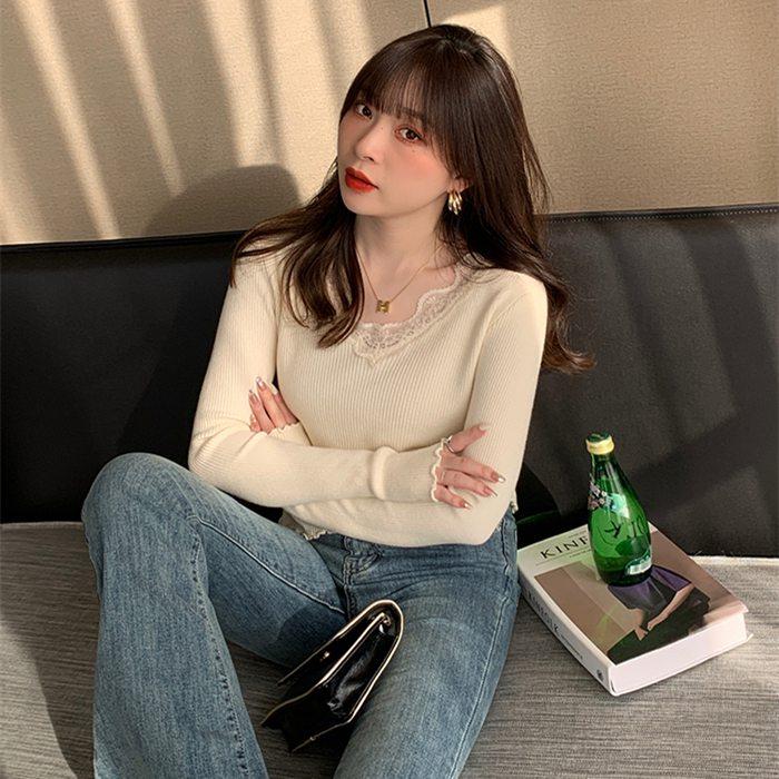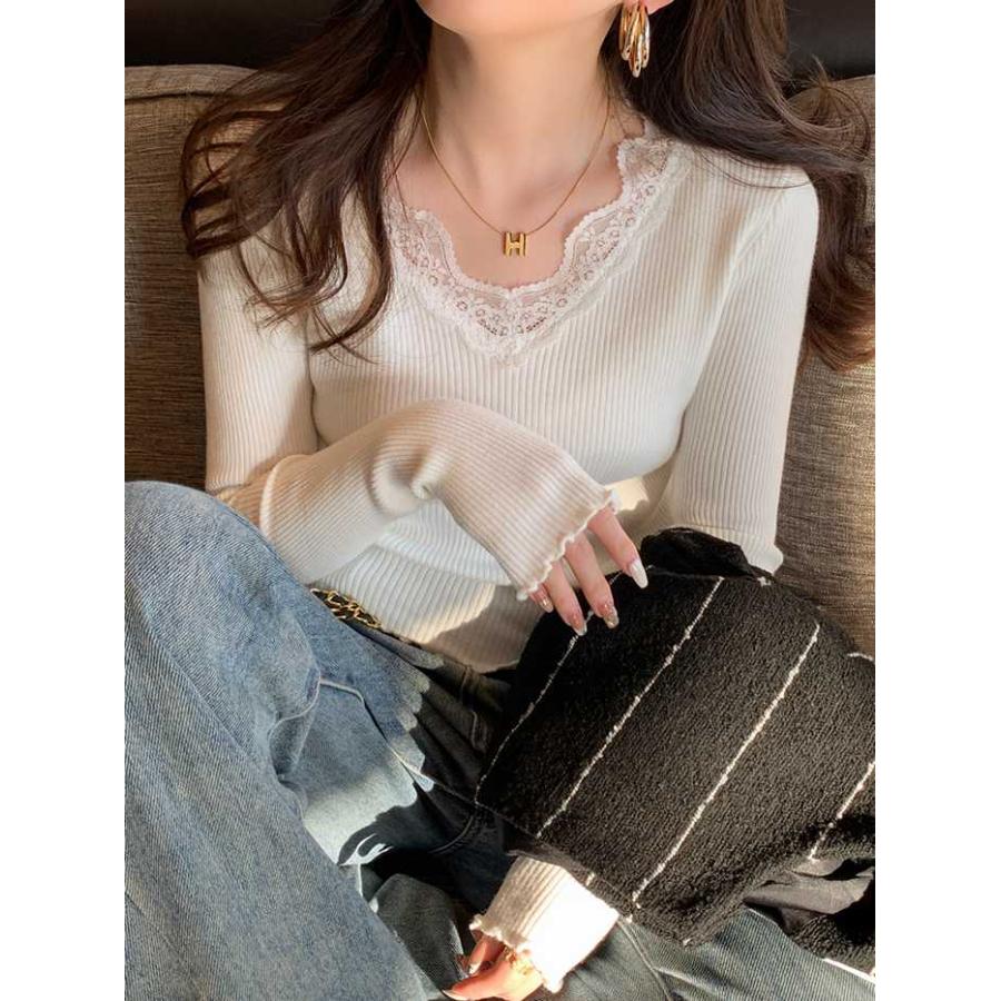 ニット Vネック レディース 長袖 インナー トップス きれいめ レースニット シンプル 秋冬 リブニット カジュアル セ