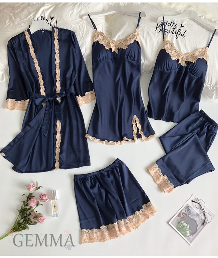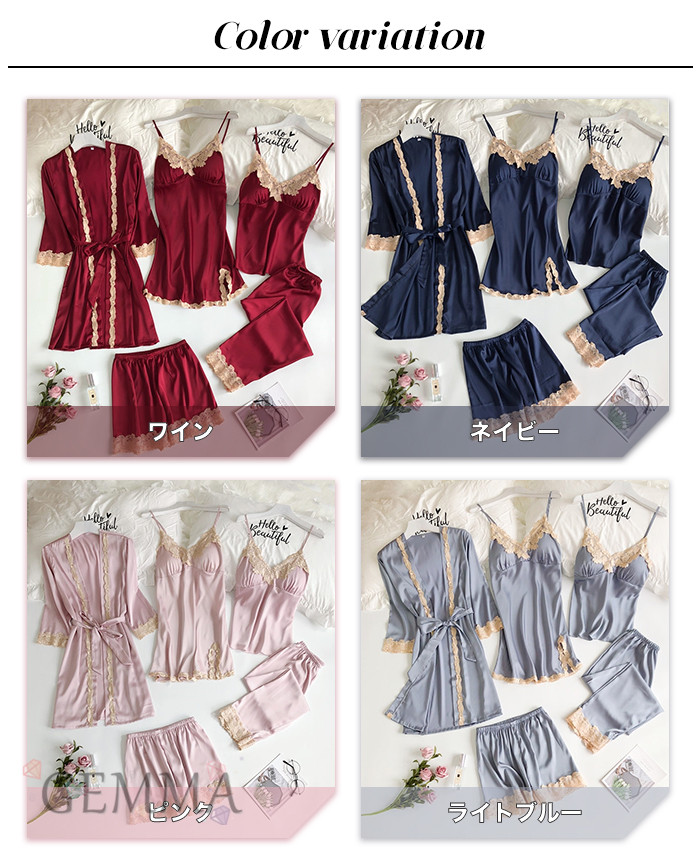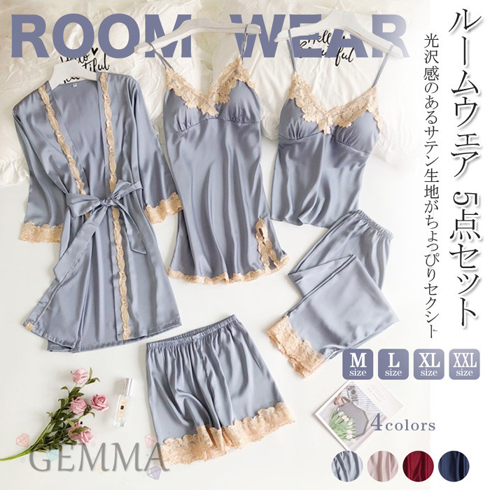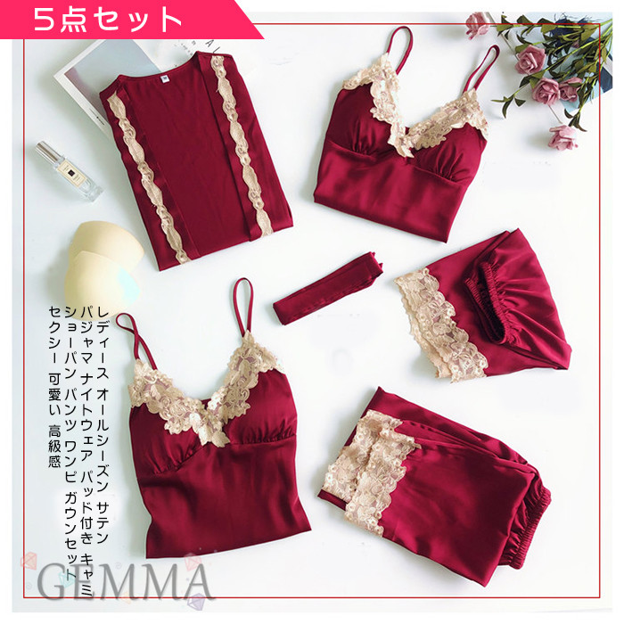 ルームウェア 5点セット パジャマ レディース オールシーズン ナイトウェア パッド付き キャミ ショーパン パンツ ワンピ ガウンセット セクシー