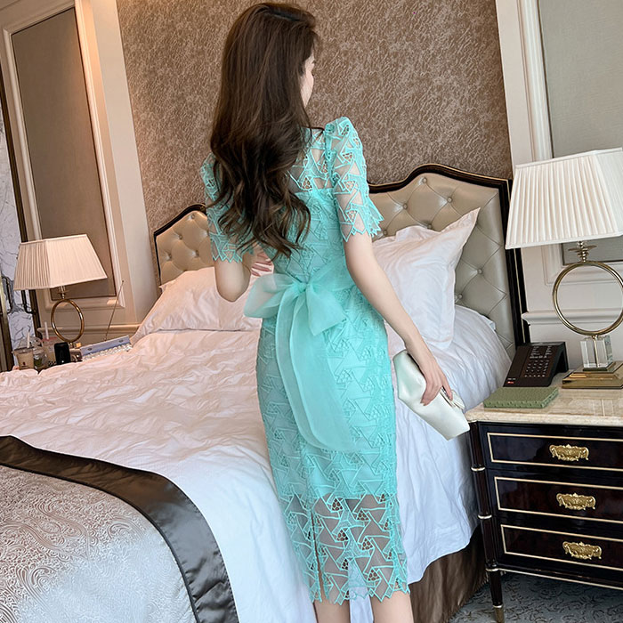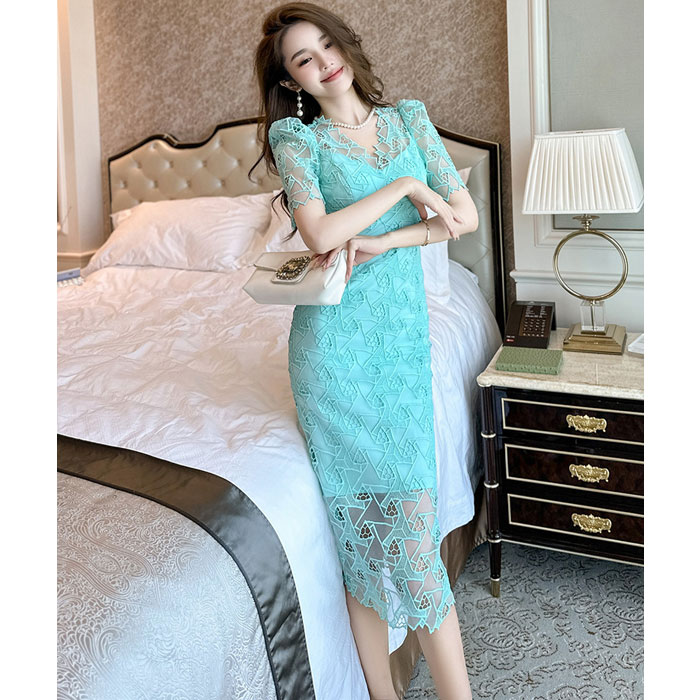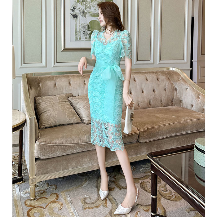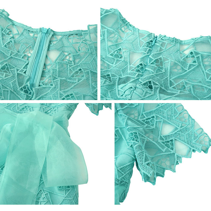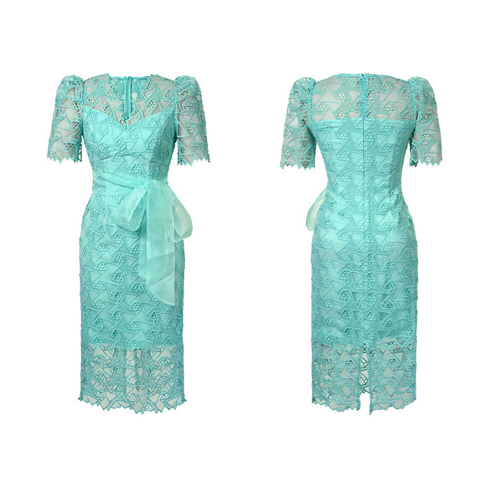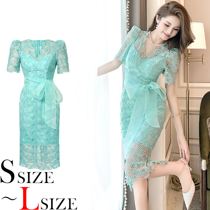 シンプルで細見えのタイトシルエットが大人のおしゃれな色気を放つ、膝下ミモレ丈ワンピースです。 鮮やかで繊細なエメラルドグリーン系緑色カラーに肌触り良い生地やシースルーレース刺繍がラグジュアリーなオーラを放ちます。軽やかな半袖肩回りが暑い季節にも良く合い、お呼ばれ結婚式やパーティーなどでもとてもお薦めです。 着心地も良い、大人スタイルのドレスワンピ。