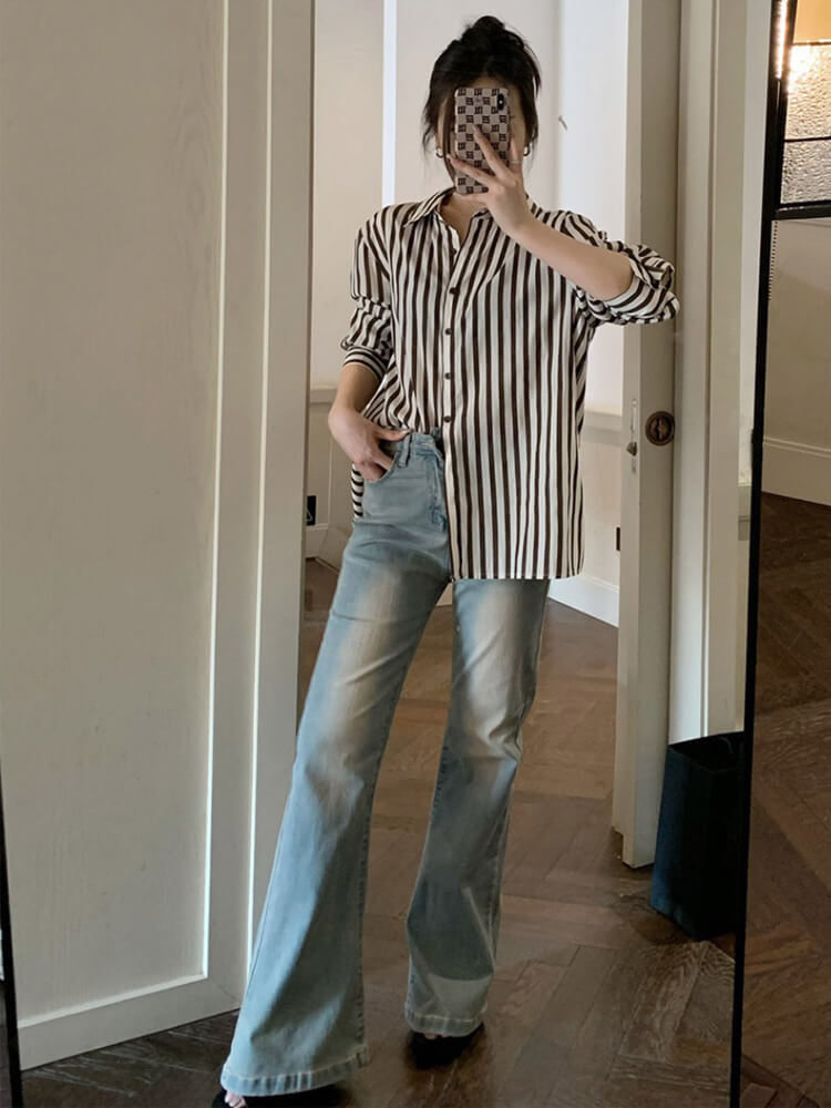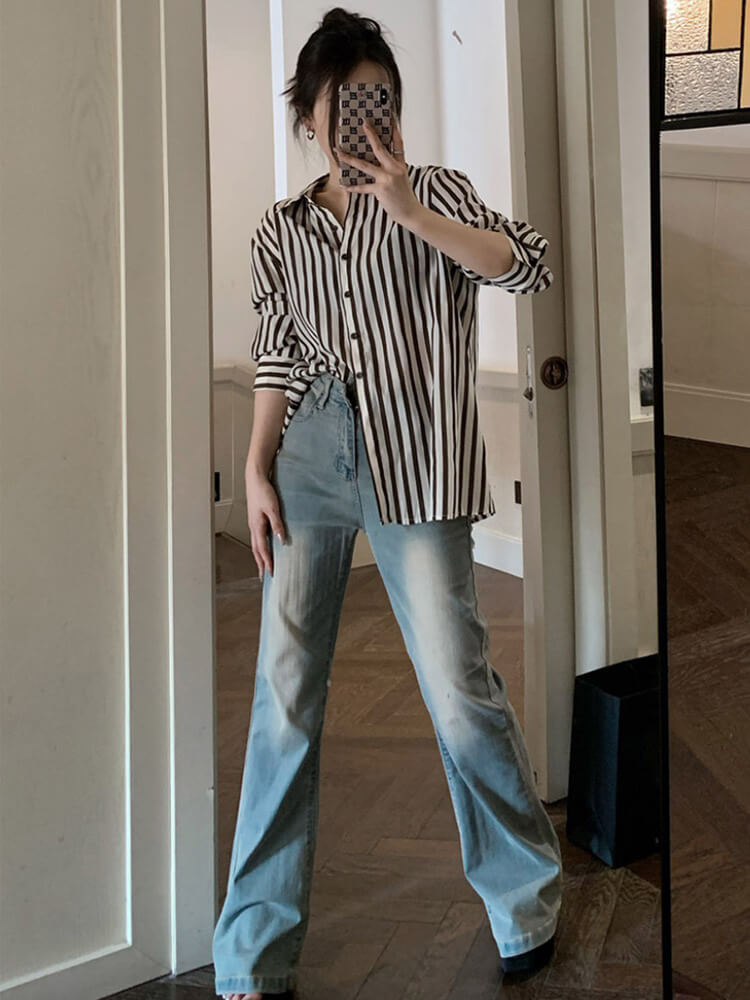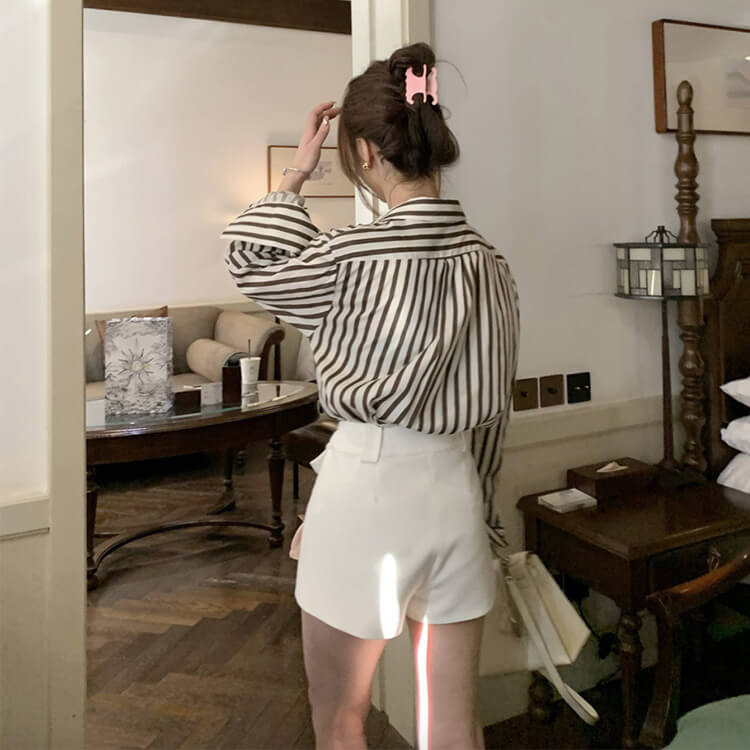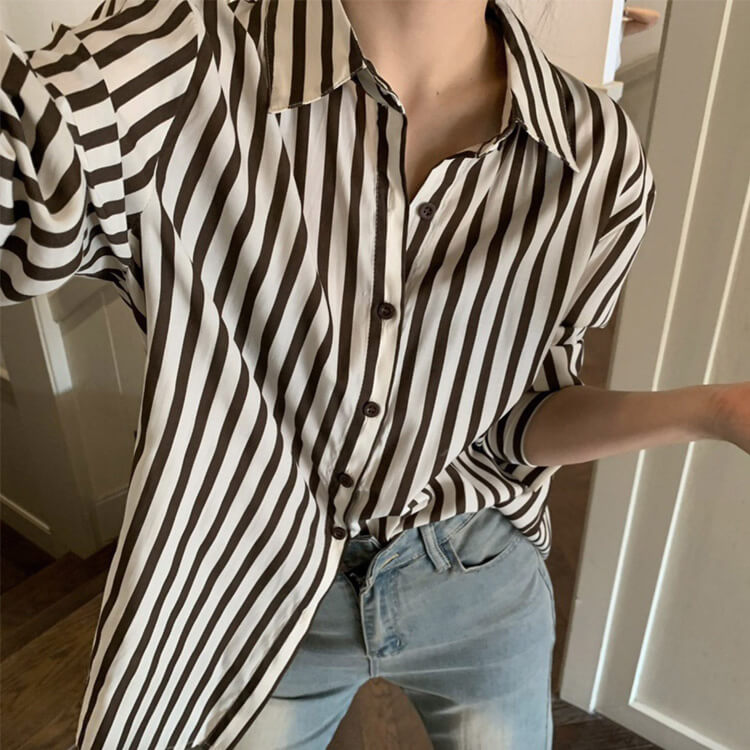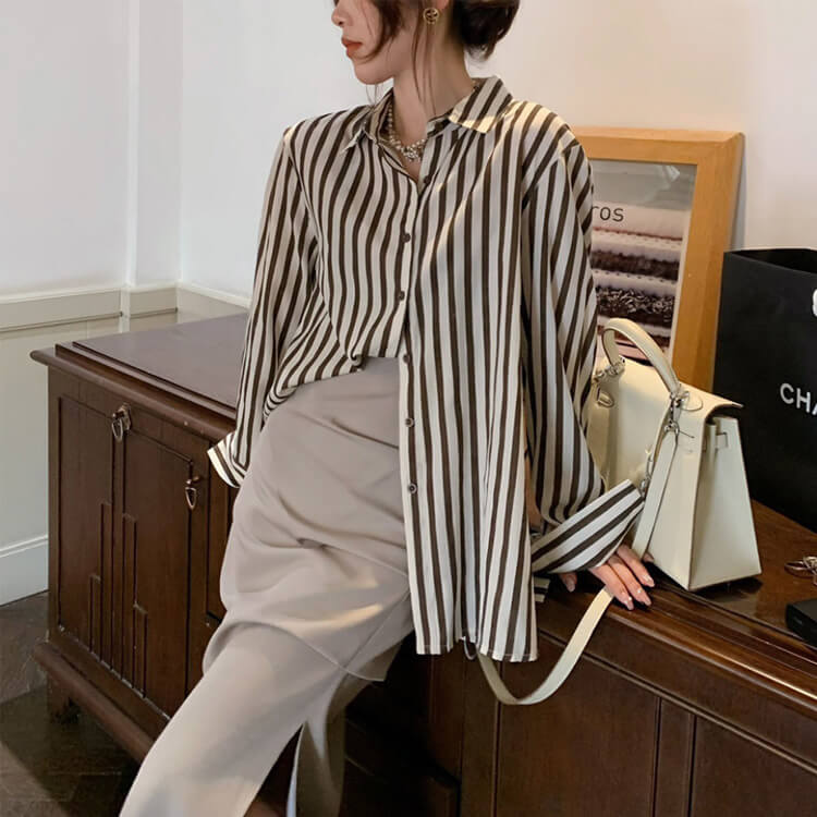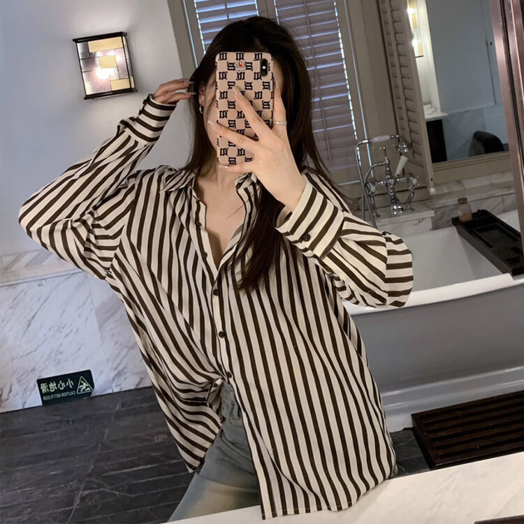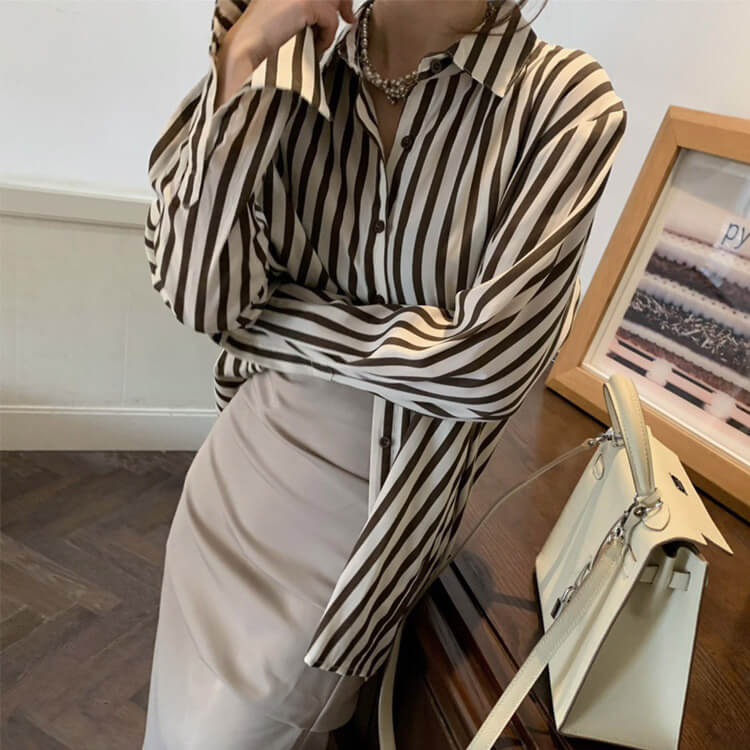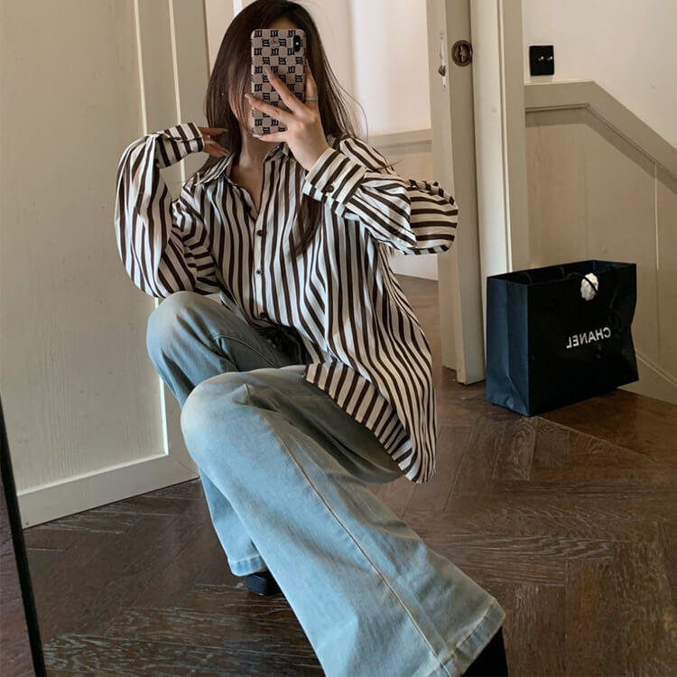 韓国デザインのクールなストライプ柄長袖シャツ。