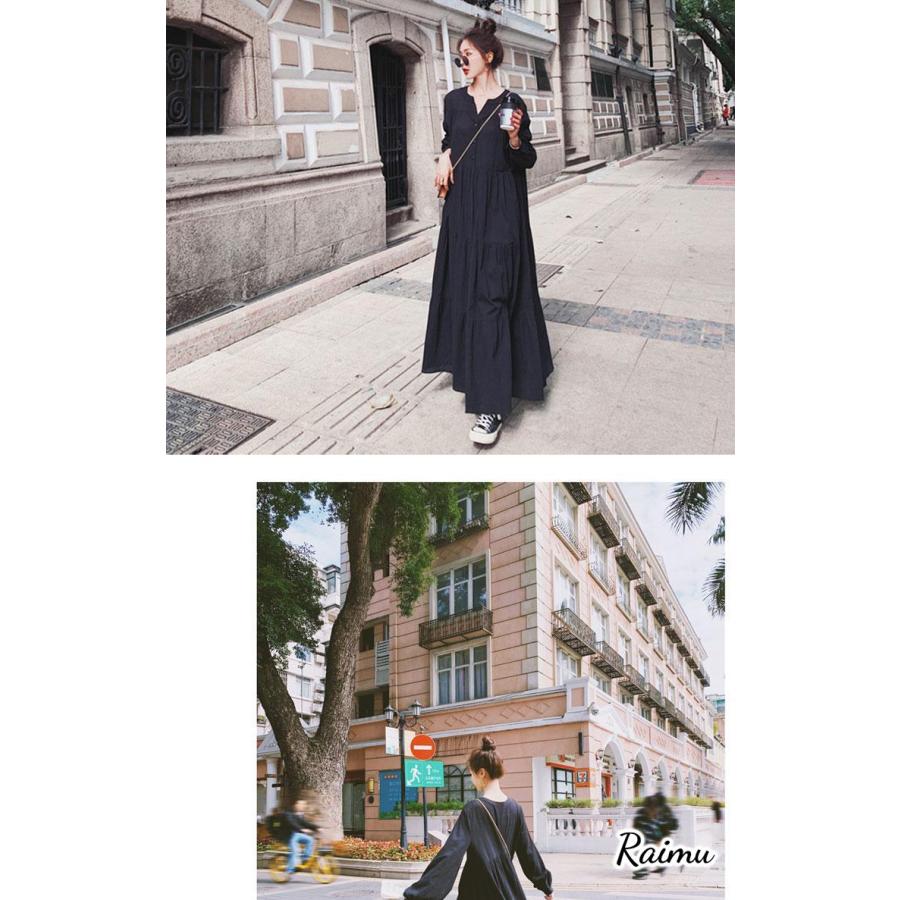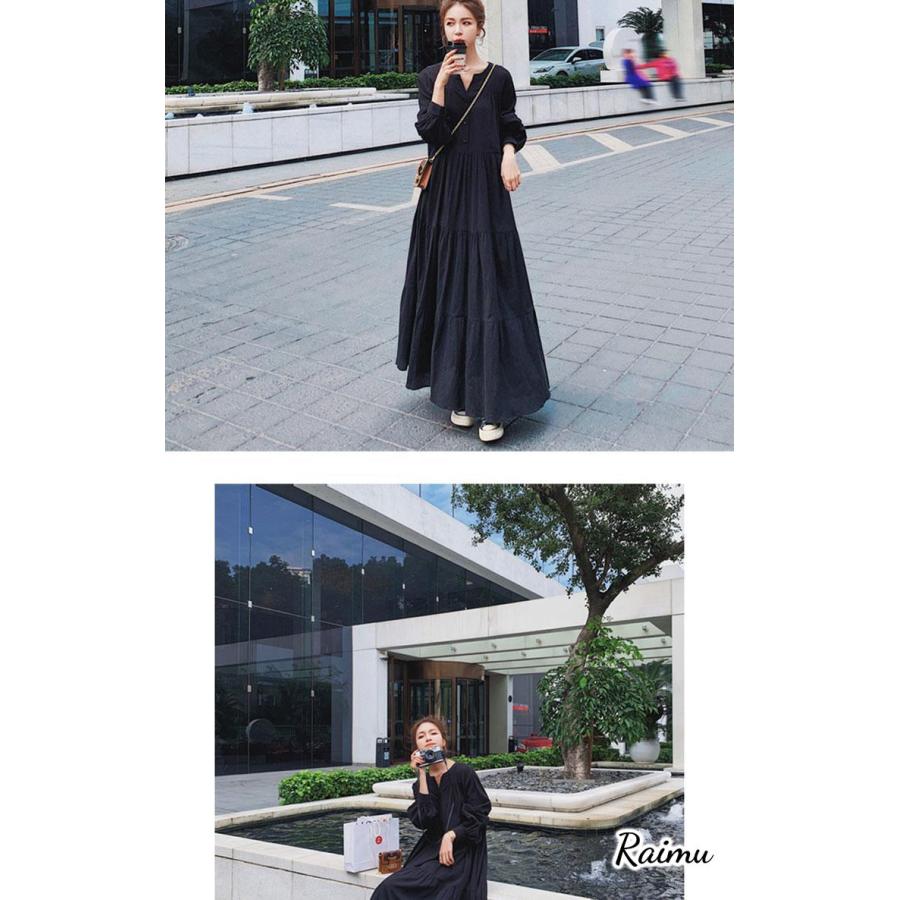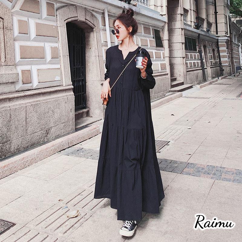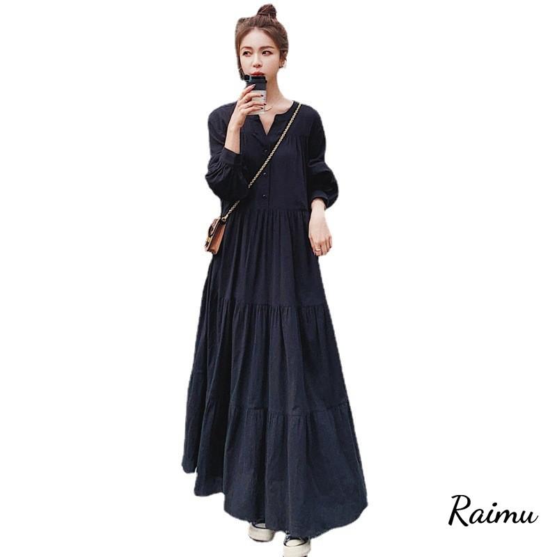 ワンピース レディース マキシ丈ワンピース 長袖 おしゃれ きれいめ 黒ワンピ Vネック 揺れる 可愛い 上品 きれいめ ゆったり 着痩せ 春夏秋冬 ティアード