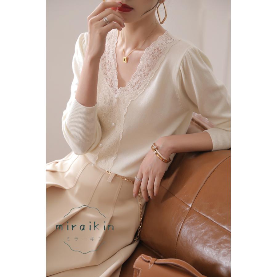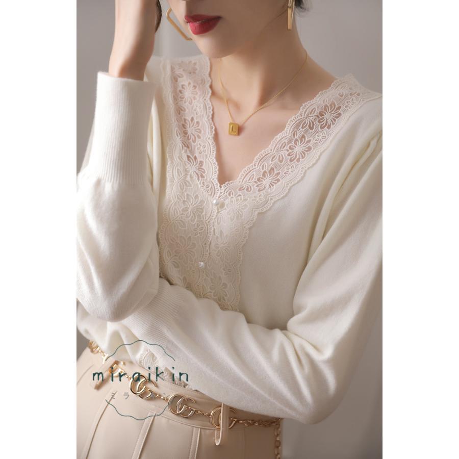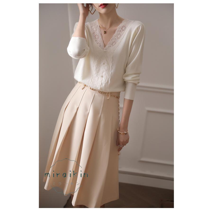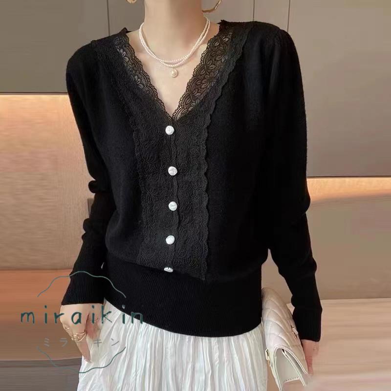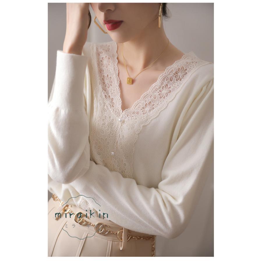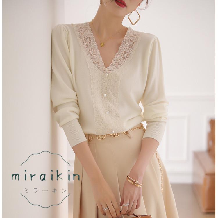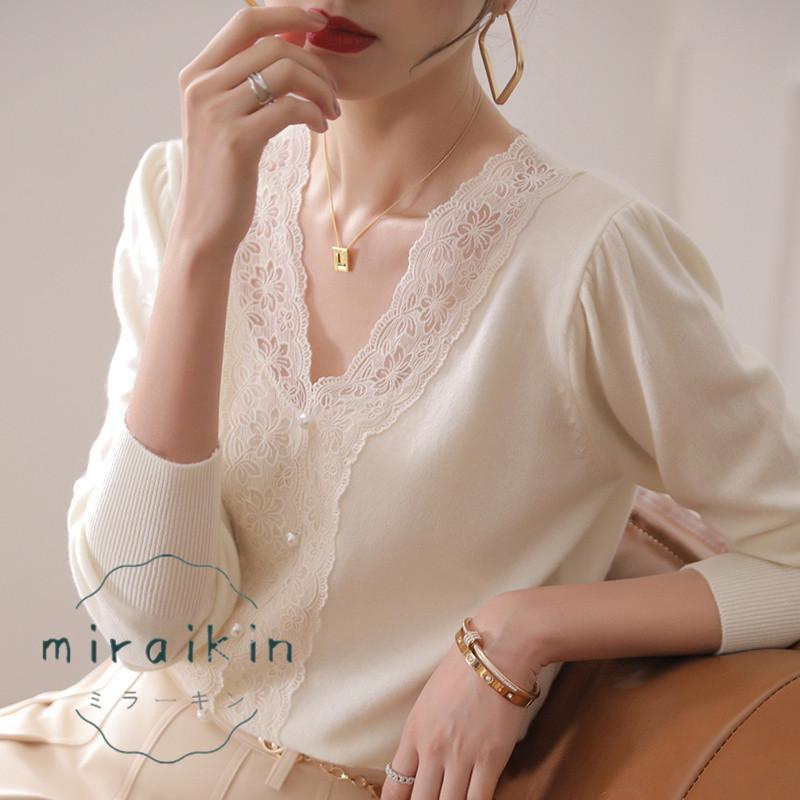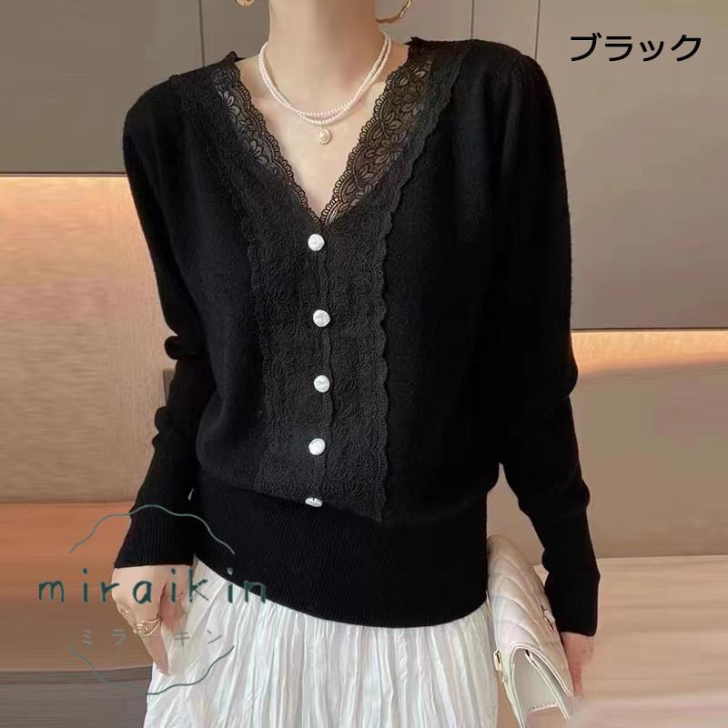 ニットトップス レディース 春 夏 春夏 黒 白 Vネック レース サマーニット セーター トップス ゆったり 長袖 ホワイト ブラック 体型カバー 30代