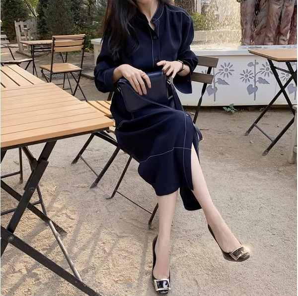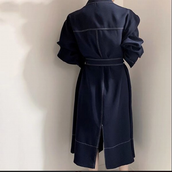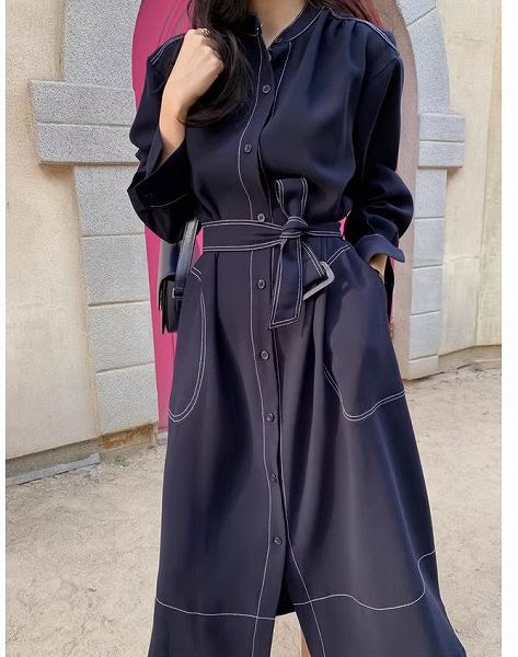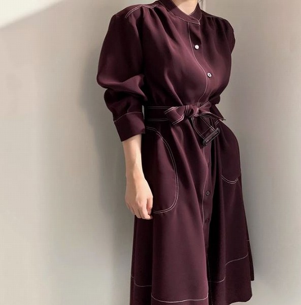 ダンガリーエレガンスワンピース パフスリーブウエストリボン スタンドカラー後ろスリット フレアワンピース長袖 送料無料ほっそり効果20代30代40代50代60代