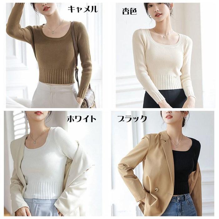リブニット インナー 長袖 無地 ニット スクープドネック おしゃれ セクシー エレ柔らかい レディース シンプル シルエット トップス