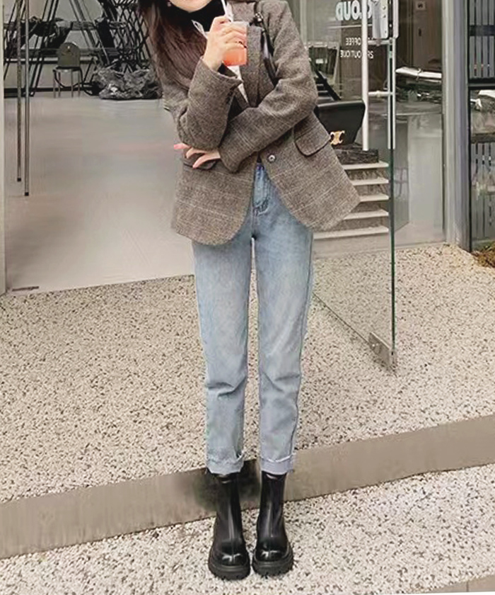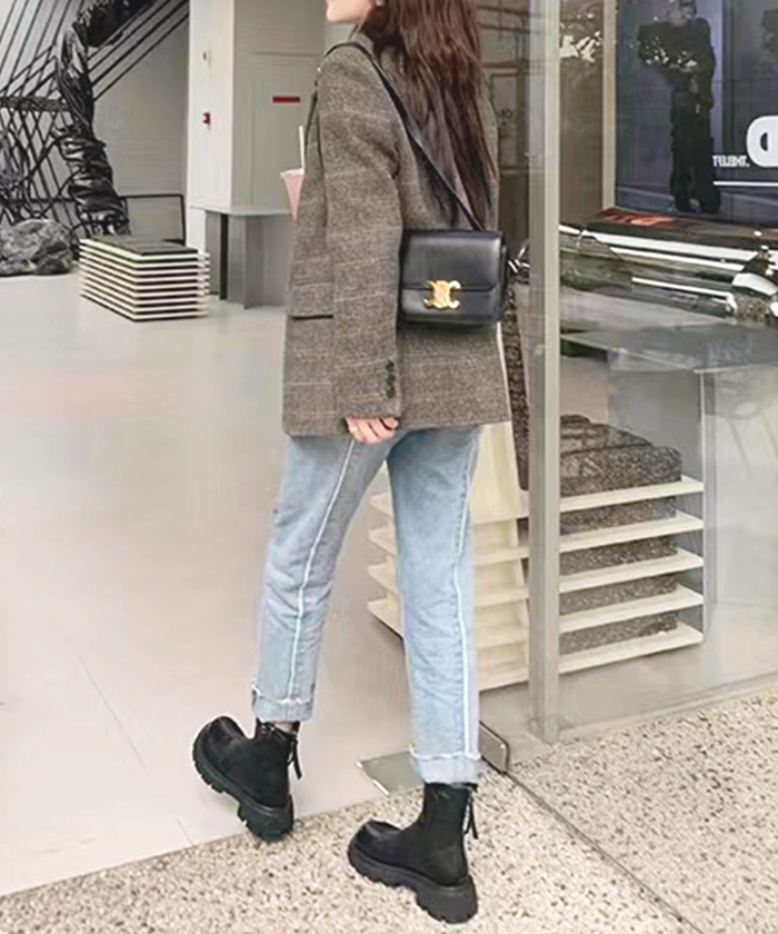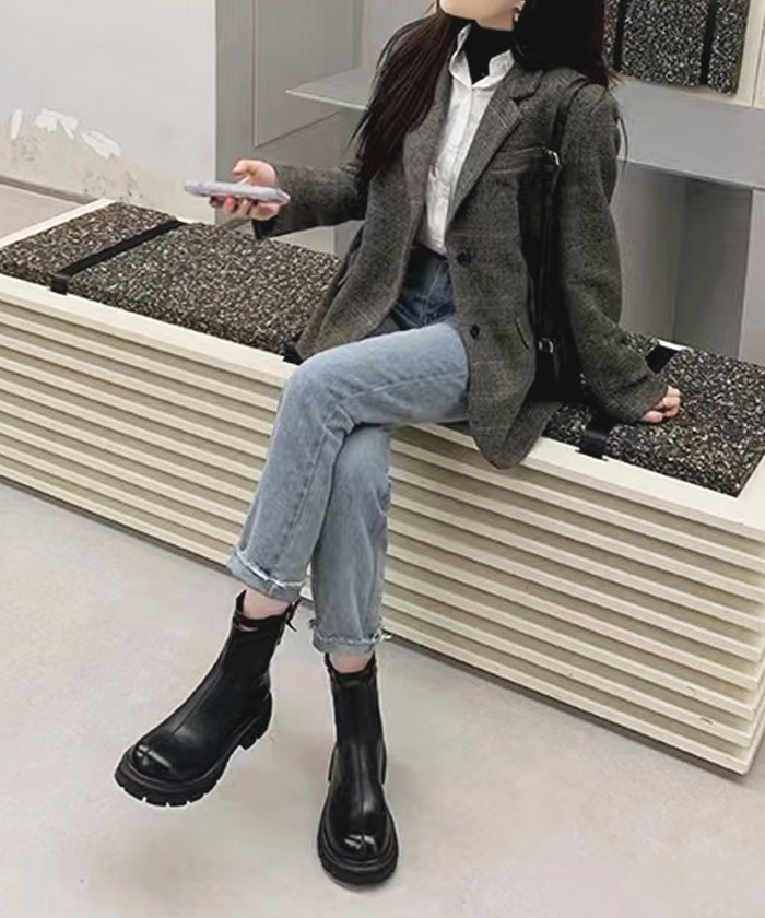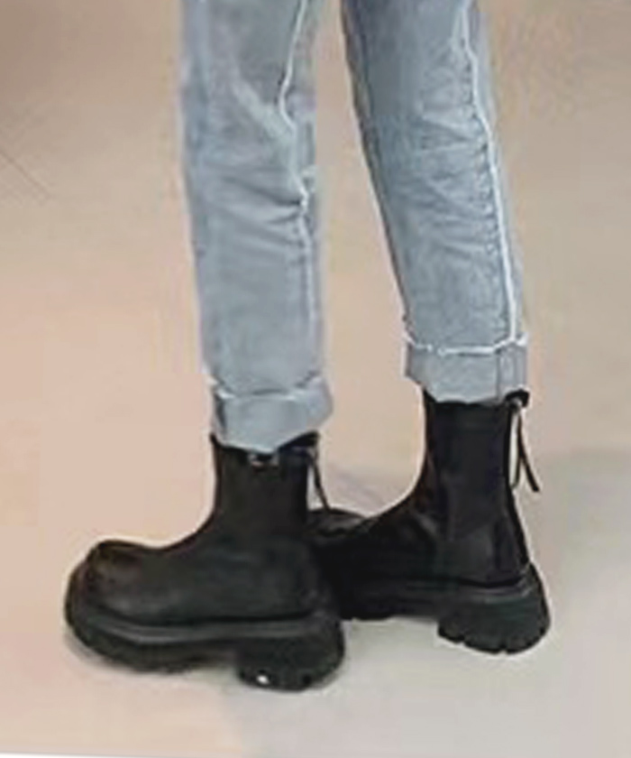 足首のシルエットにゆとりがあるので靴下をチラ見せする履き方もおすすめのデザインブーツです。