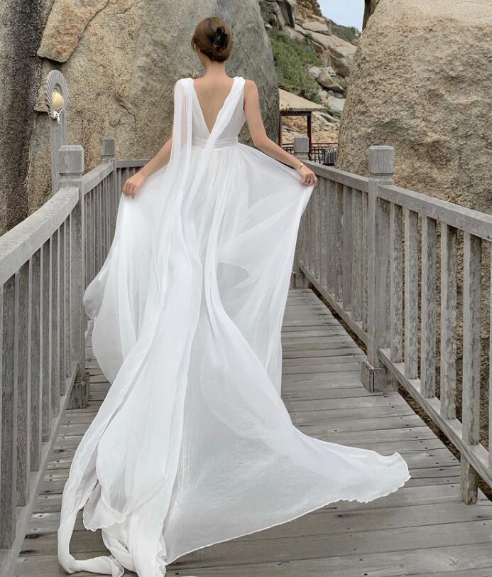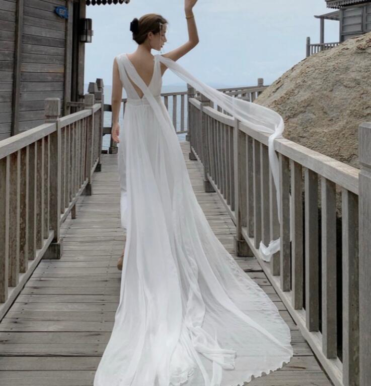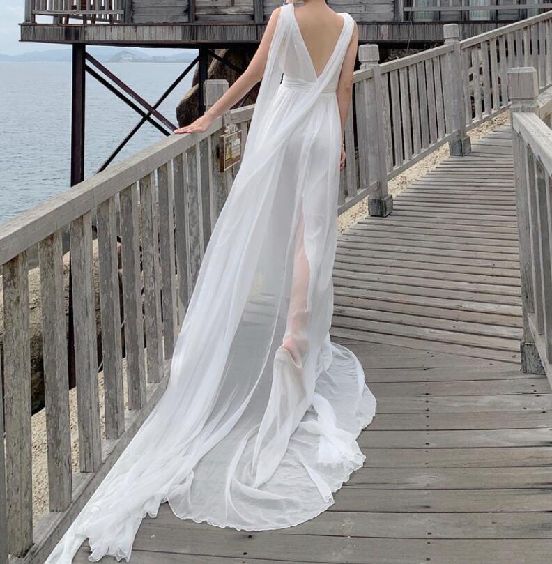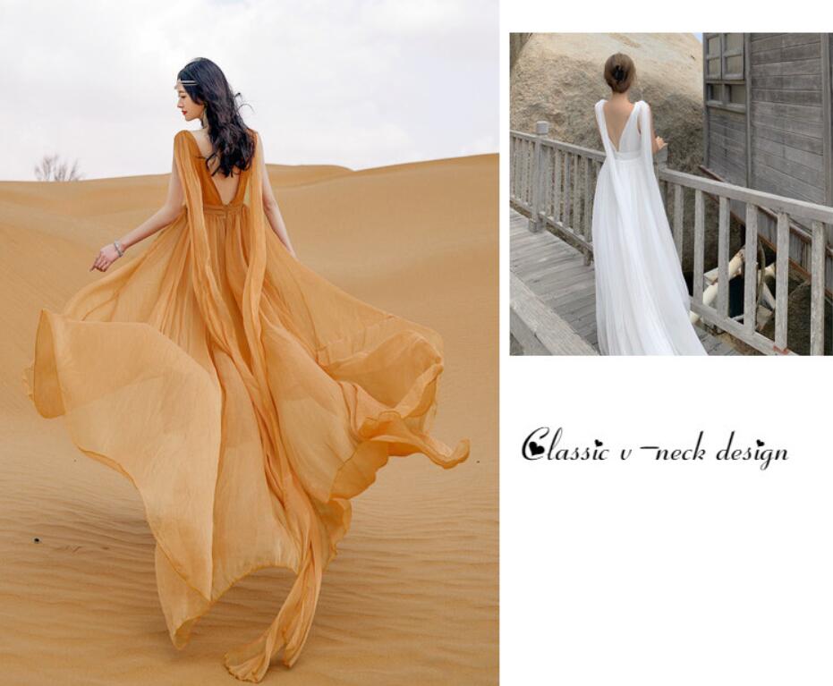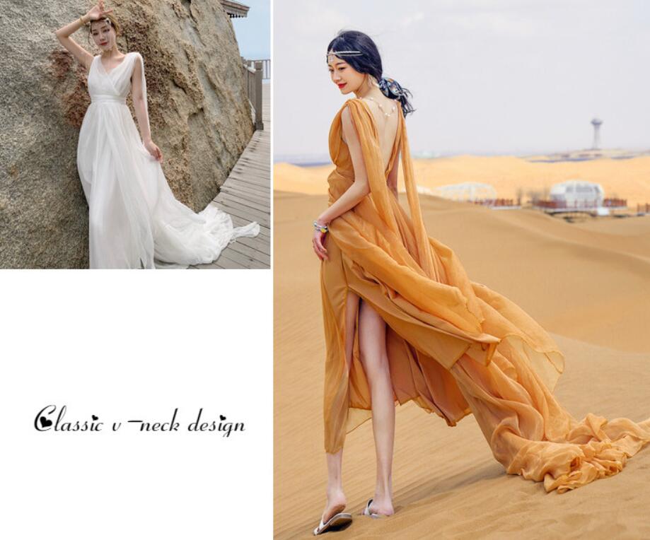レディース ビーチドレス フィッシュテール ワンピース カラードレス 広がる 海旅行用ドレス 大裾幅 エレ天使風 Vネック バックレス トレーン