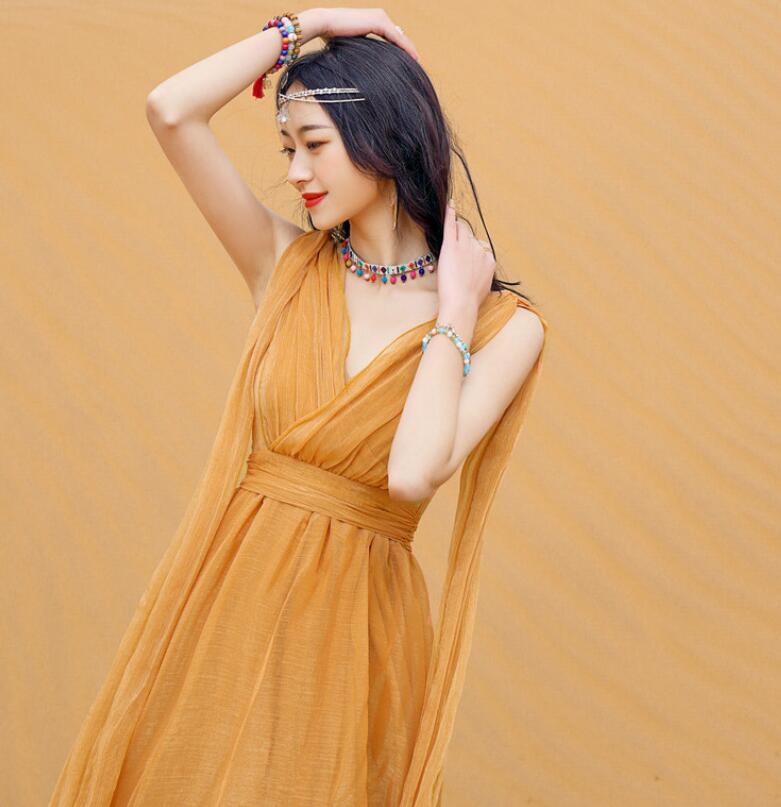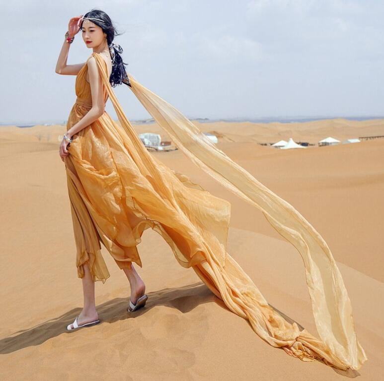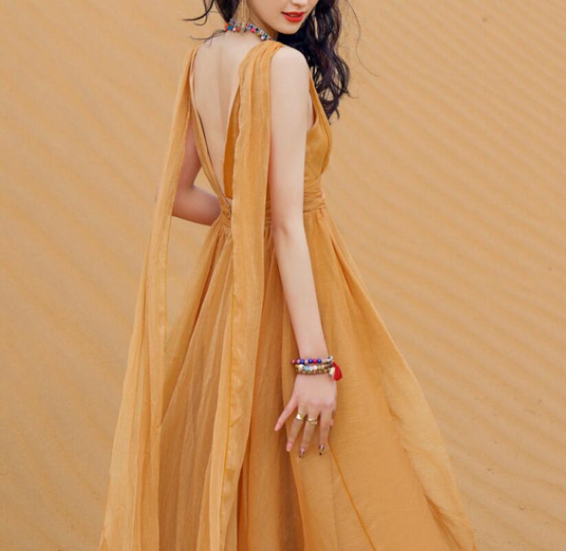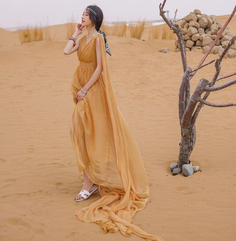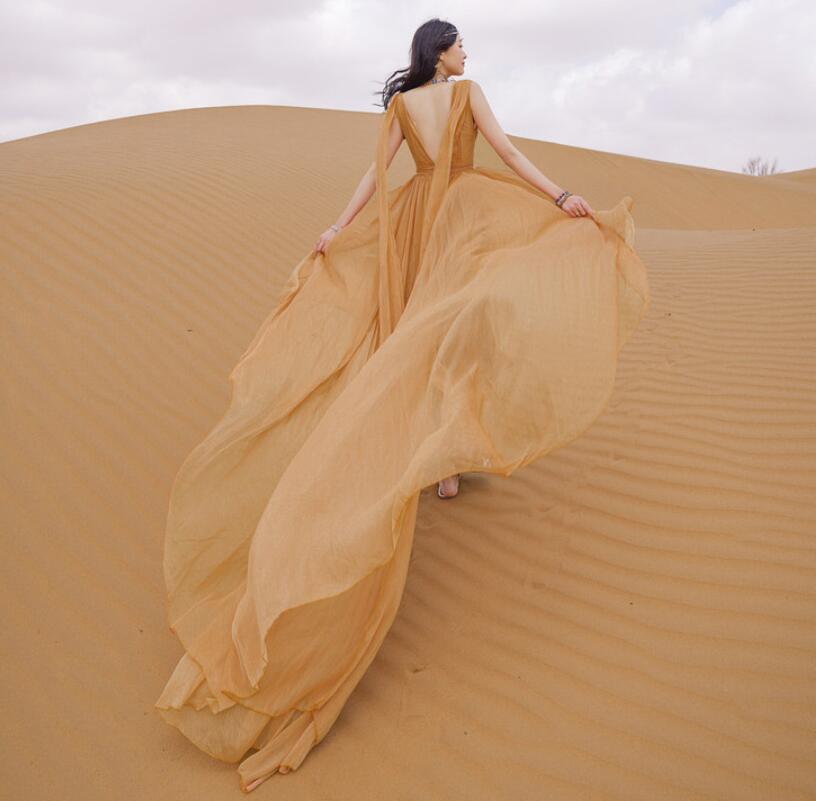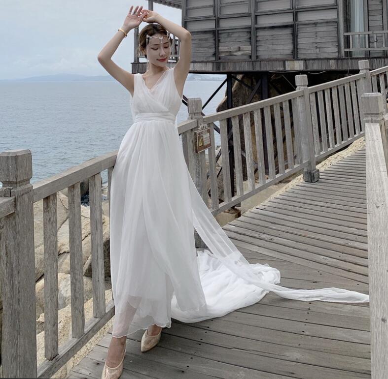 レディース ビーチドレス フィッシュテール ワンピース カラードレス 広がる 海旅行用ドレス 大裾幅 エレ天使風 Vネック バックレス トレーン