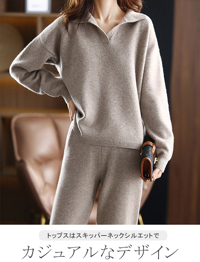 トップスはスキッパーネックシルエットでカジュアルなデザイン
