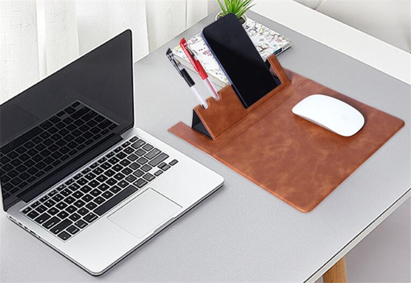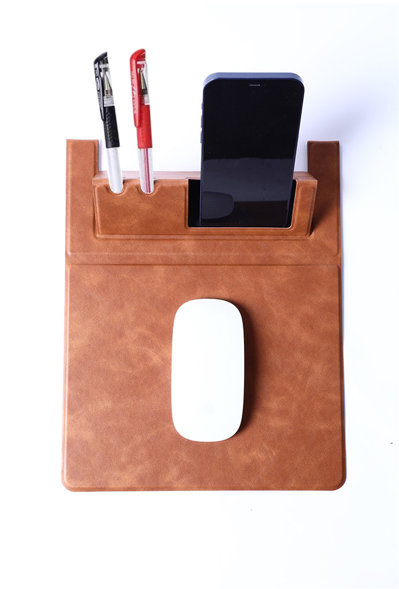 小物を収納し、スマホをスタンドできる折りたたみマウスパッドです。
