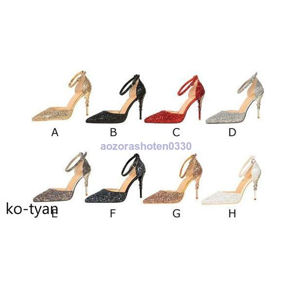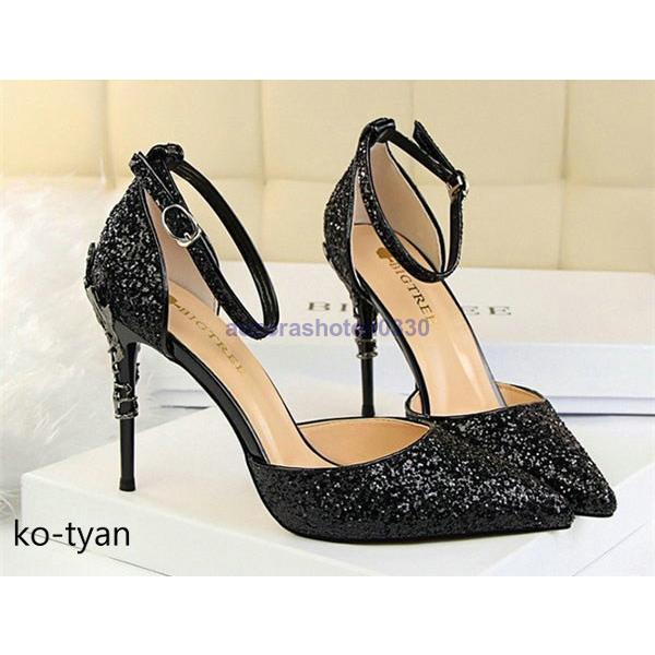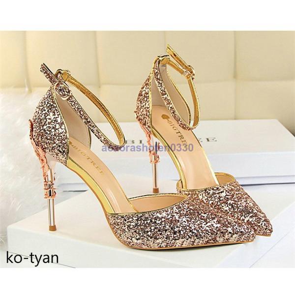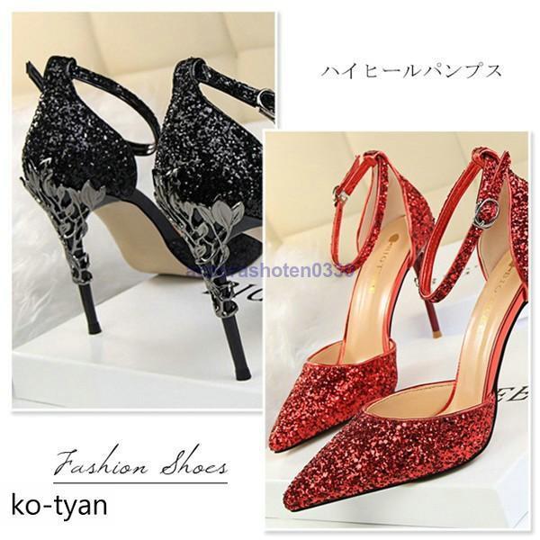 パンプス 結婚式 ストラップ 脱げない 彫り風ヒール ハイヒール フォーマル おしゃれ サイドオープン パーティー痛くない グリッター