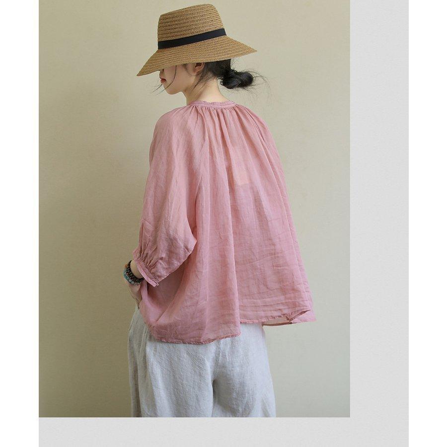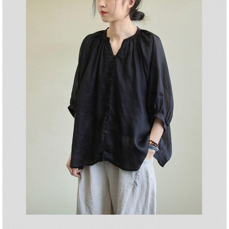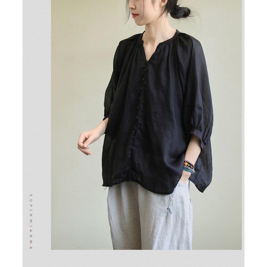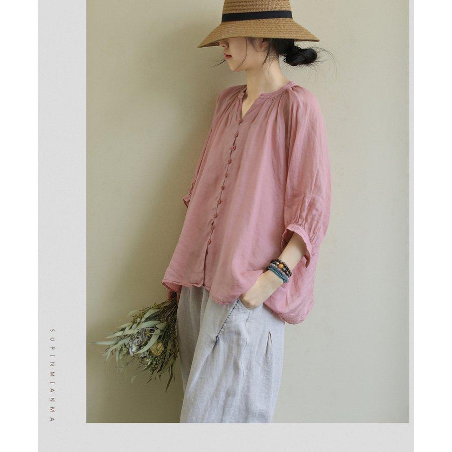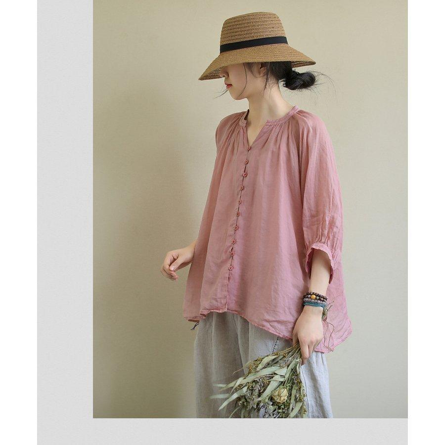 ブラウス レディース 40代 春夏新作 オシャレブラウス リネンシャツ カジュアル Vネック 無地 七分袖トップス 50代 通勤OL シャツ 大人 ゆったり 上品 30代
