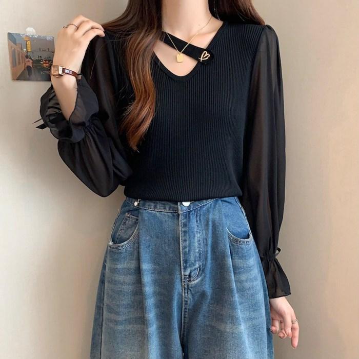 ニットトップス 異素材 切り替え シフォン袖 レディース Vネック シフォン シアースリーブ トップス ぽわん袖 ニット 長袖 透け感 プルオーバー 無地 薄手 体型カバー シンプル 秋 春 デイリー スタイリッシュ