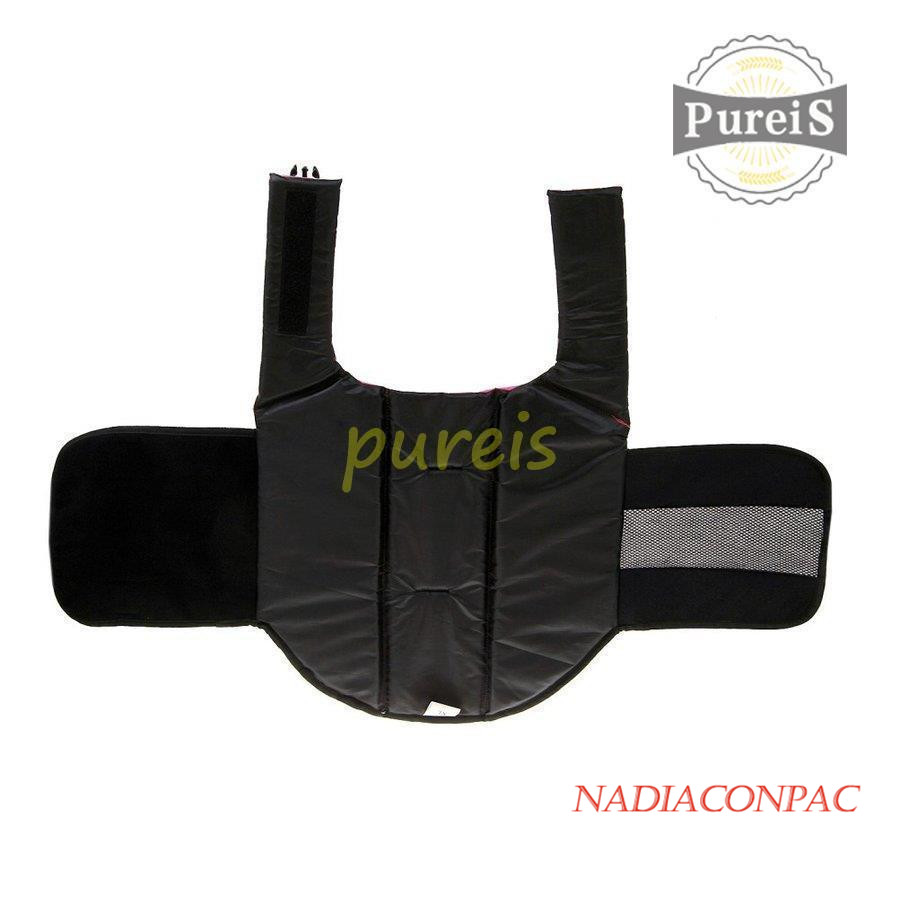 ○装着は簡単、首元は調節可能なベルトと、しっかり留まるバックル装着方式