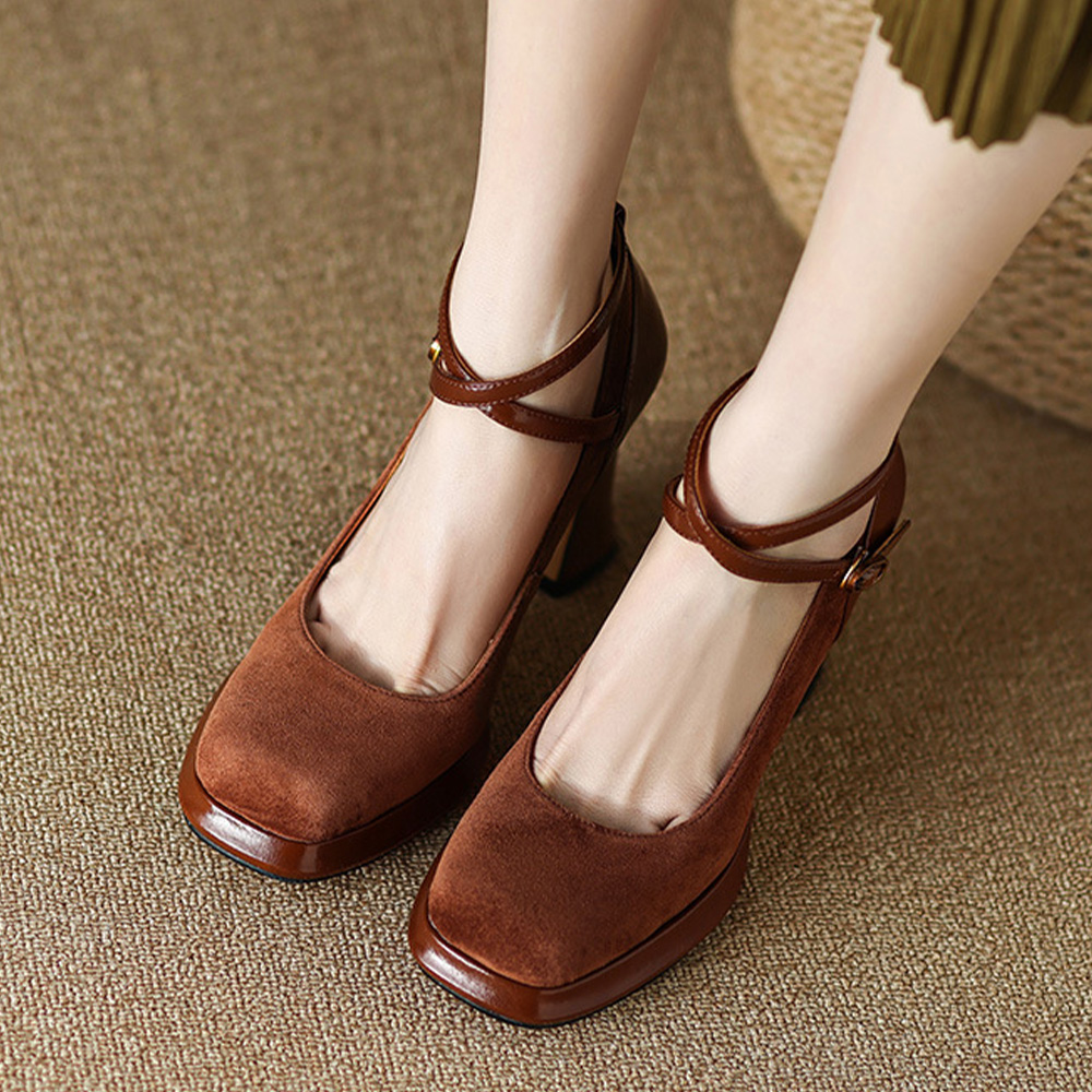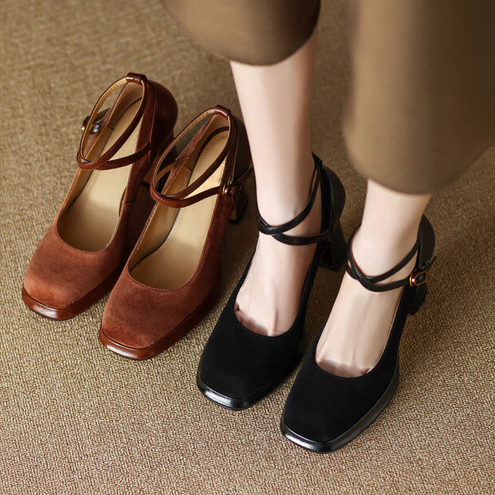 スクエアトゥとスエード調が上品な印象を与えてくれるパンプス。