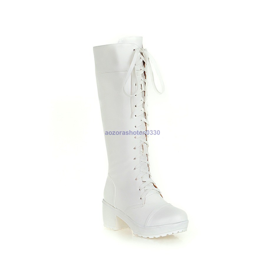編み上げブーツ レディース 太ヒール ハイヒール ストーム 黒 おしゃれ 22CM-25CM レースアップ春秋 白 ロ