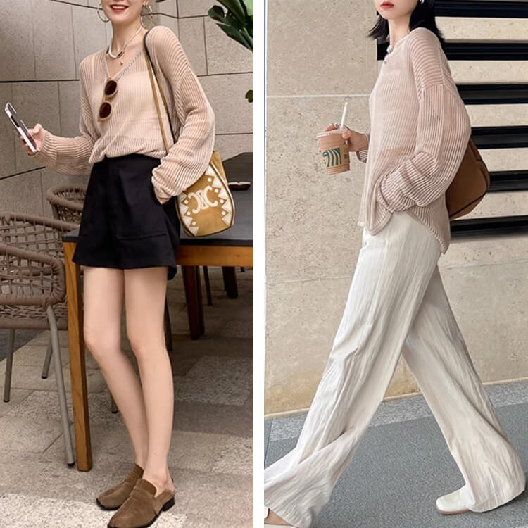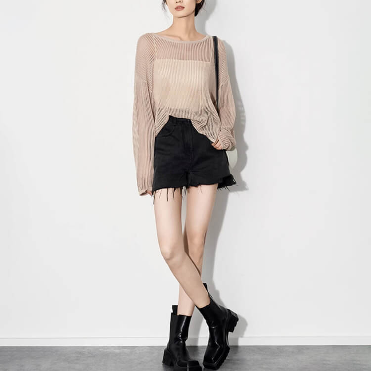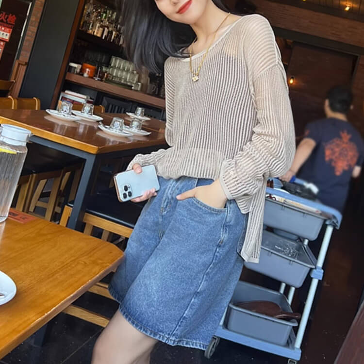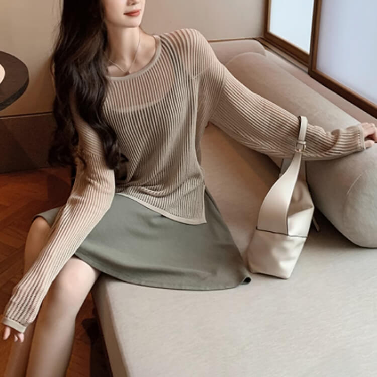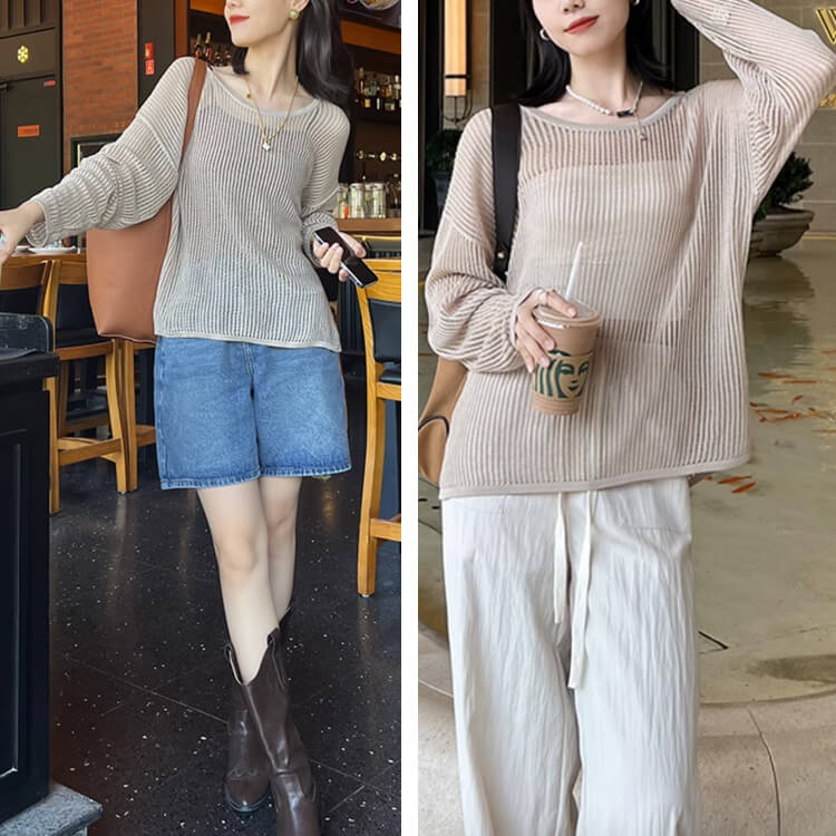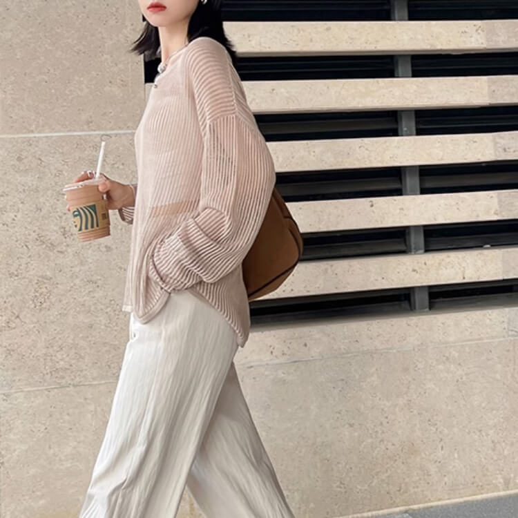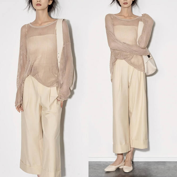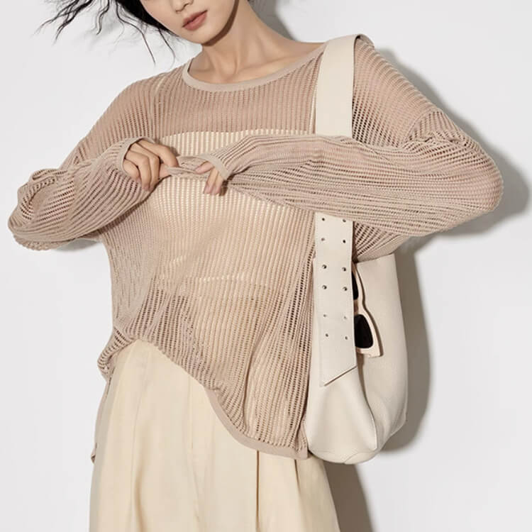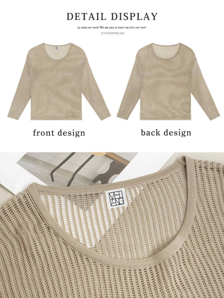 縦ラインの透かし編みでチラ見えする透け感がおしゃれな長袖トップス。