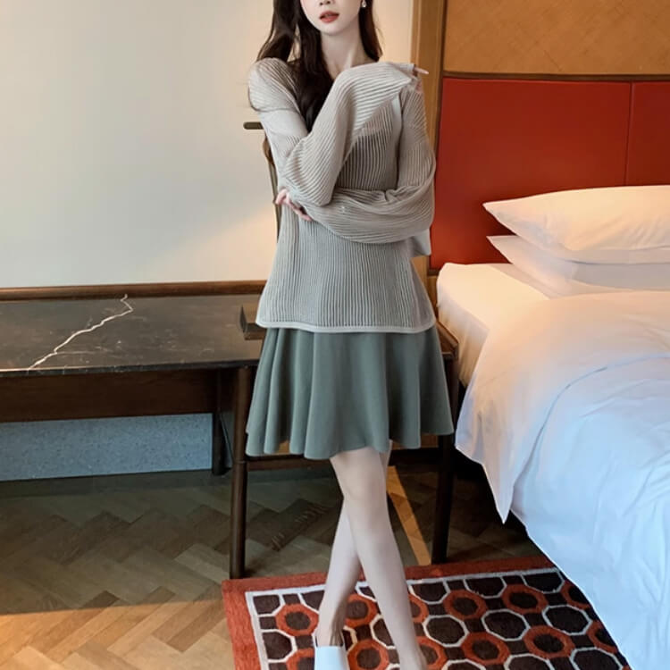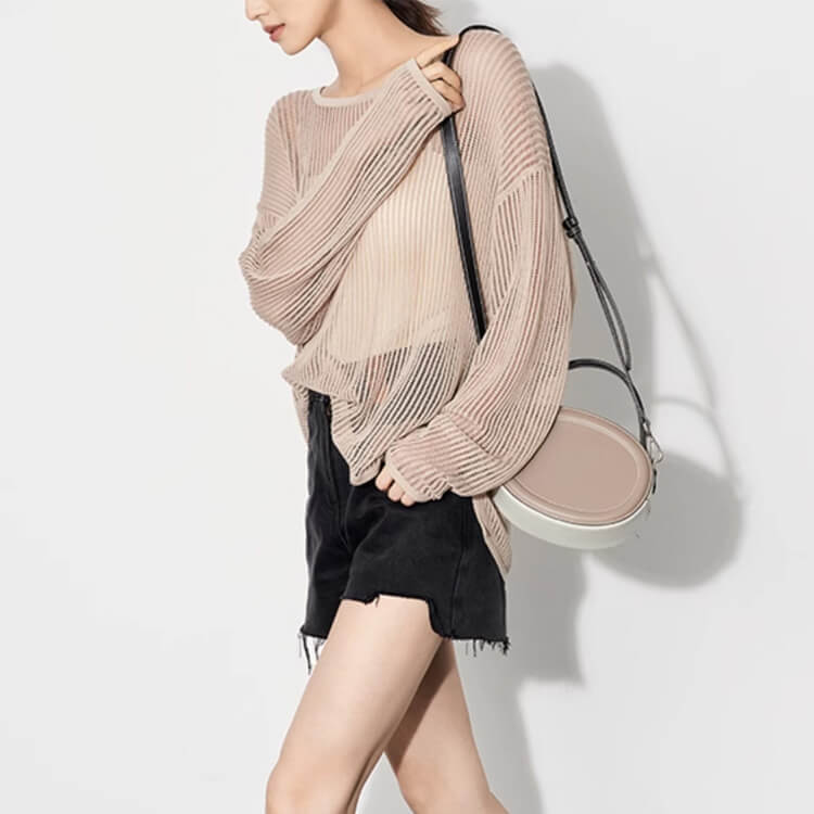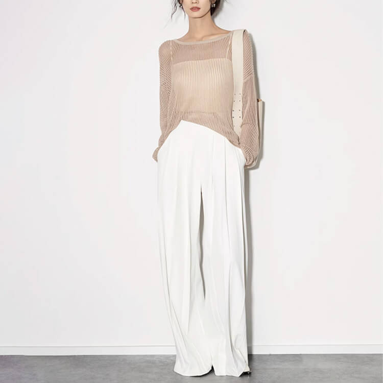 大きく開いたラウンドネックで首元の空白を強調してメリハリを。