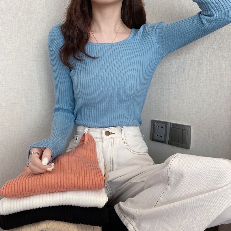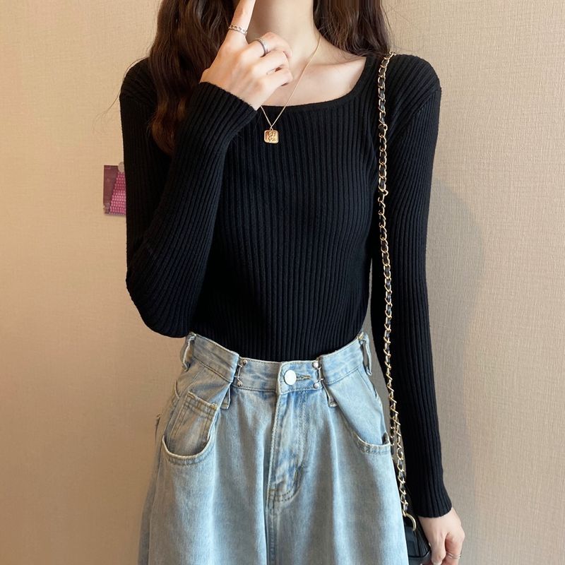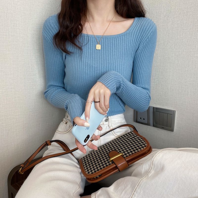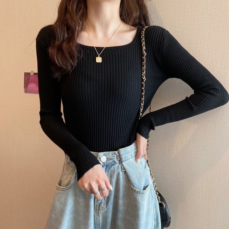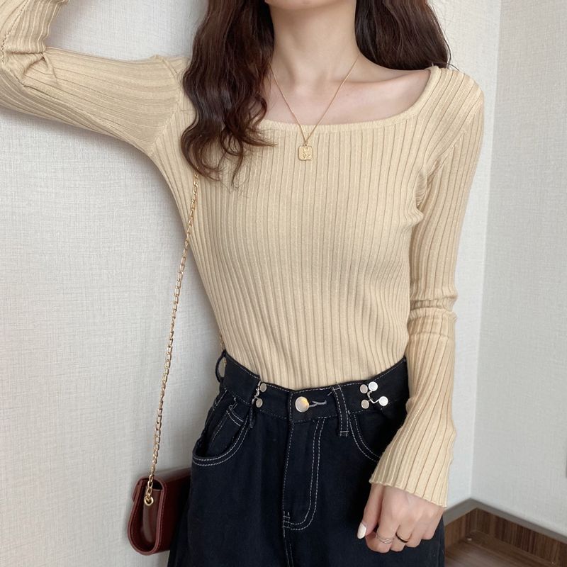 商品説明:長袖 リブニット レディース セーター スクエアネック 春 秋 冬