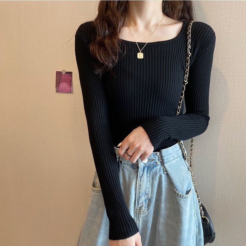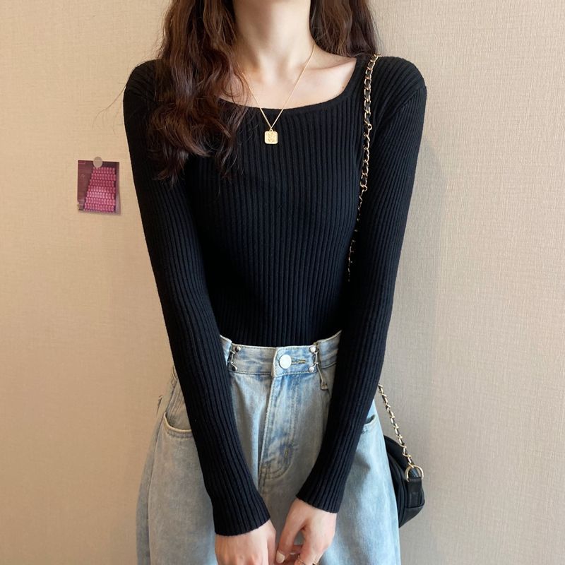 商品名:リブニット レディース スクエアネック 長袖 セーター 春 秋 冬 トップス 薄手 ニット インナー 高伸縮 ストレッチ シンプル 着回し力 きれいめ 会社 仕事 オフィス カジュアル OL ママ