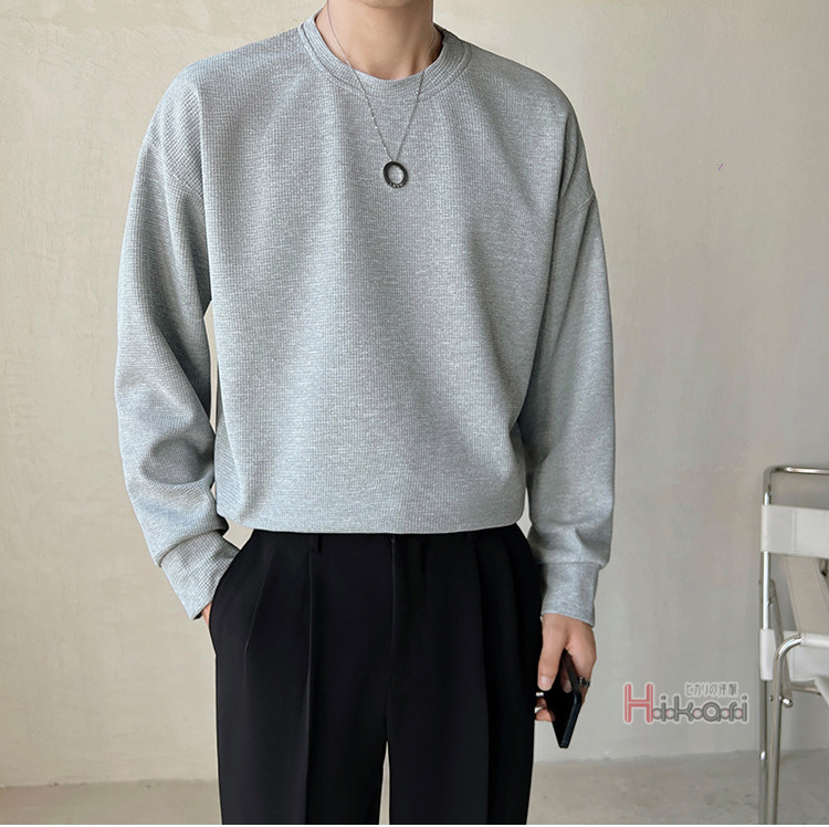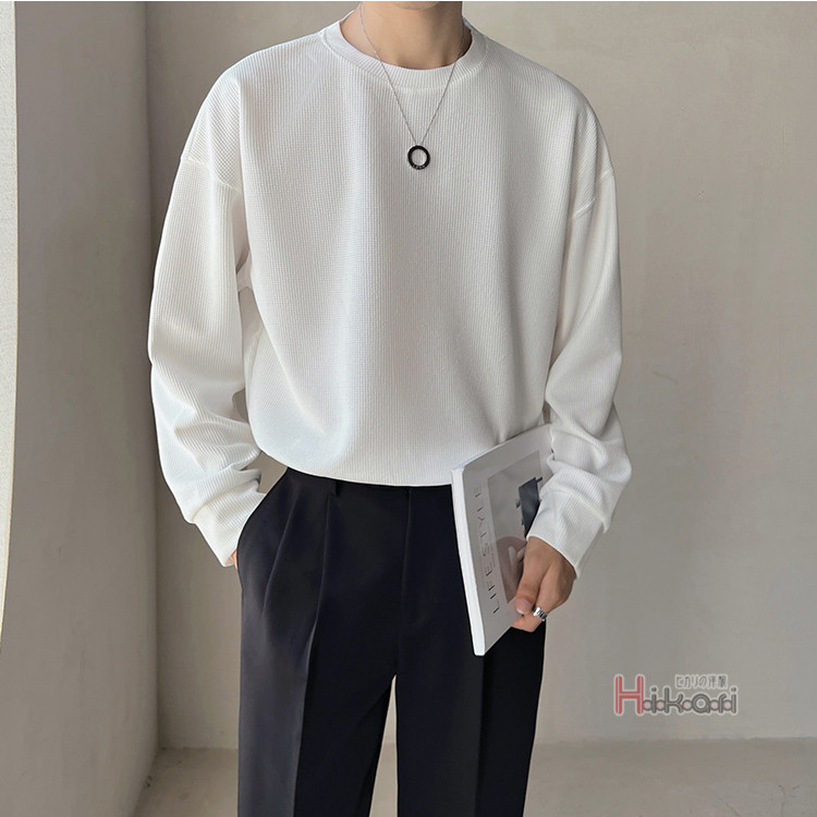 長袖 Tシャツ メンズ ワッフル生地 ロングTシャツ クルーネック 無地 シンプル ロングTシャツ ロングスリーブ カットソー