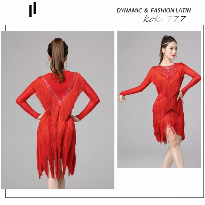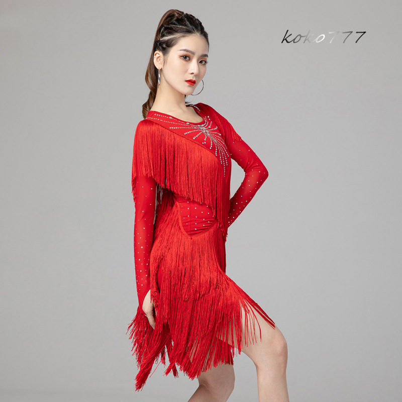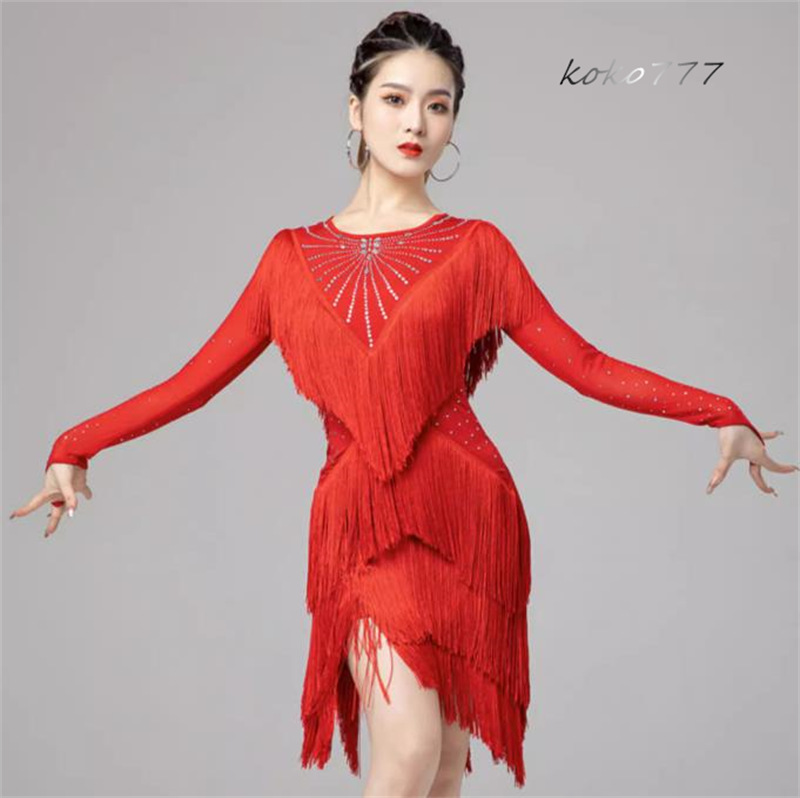 ドレス レディース ワンピース ラテンダンス ラインストーン フリンジ パーティー ライブ 発表会 舞台衣装 ワルツ モダンダンス コスチューム ひざ丈 公演