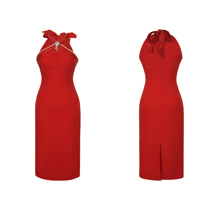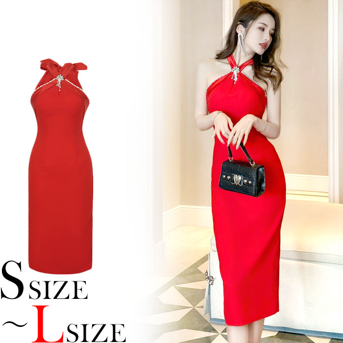 パールビジュー胸元 ノースリーブ ミモレ丈タイトワンピース 赤 キャバ スナッ