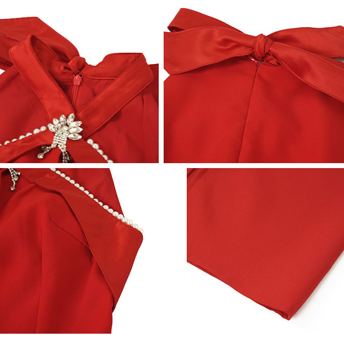 シンプルで細見えの肩出しオープンショルダーが大人のおしゃれな色気を放つ、膝下ミモレ丈ワンピースです。 鮮やかな赤色に、胸元にあしらわれたパールビジュー使いのライン、肌触り良い生地やスカート部分のスリットがセクシーラグジュアリーなオーラを放ちます。 軽やかな肩回りやノースリーブ仕立てが暑い季節にも良く合い、パーティーなどでもとてもお薦めです。 着心地も良い、大人スタイルのドレスワンピ。