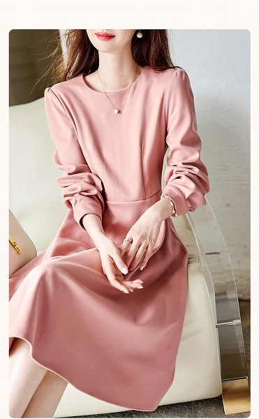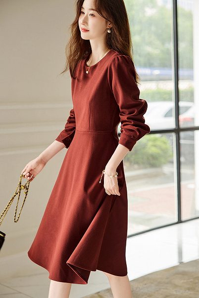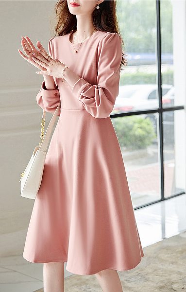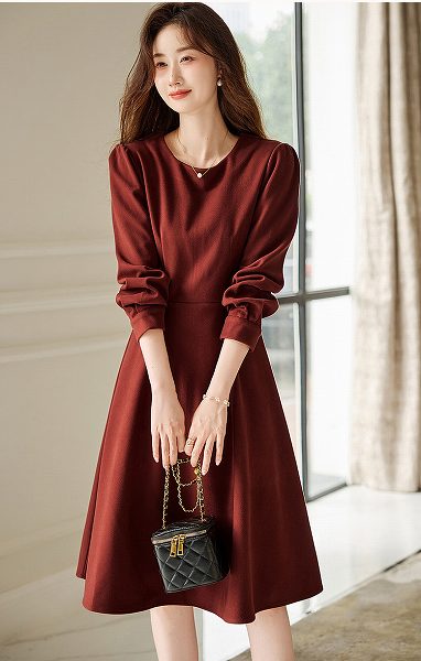 お嬢様ワンピース 長袖 ラウンドネック フレアスカート ひざ下丈 大きいサイズあり Sから2L 上品 通勤通学20代30代40代50代60代