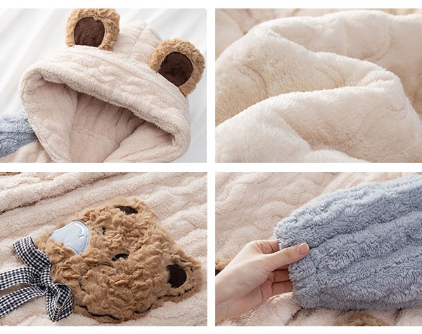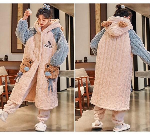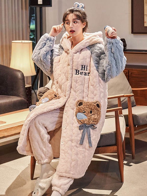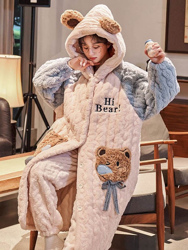 ルームウェア もこもこ 熊柄 パジャマ 冬 長袖 ナイトガウン 着る毛布 前開き フード付き 寝巻き 部屋着 暖かい あったか 。 モコモコ 大人用 ふわふわ 動物 レディース 女性用 ガウン かわいい 可愛い ギフト プレゼント N1D7