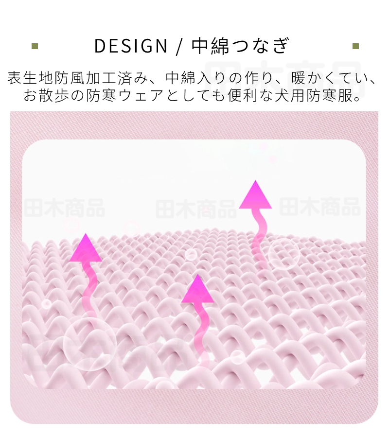 表生地防風加工済み、中綿入りの作り、暖かくて軽い、お散歩の防寒ウェアとしても便利な犬用防寒服。