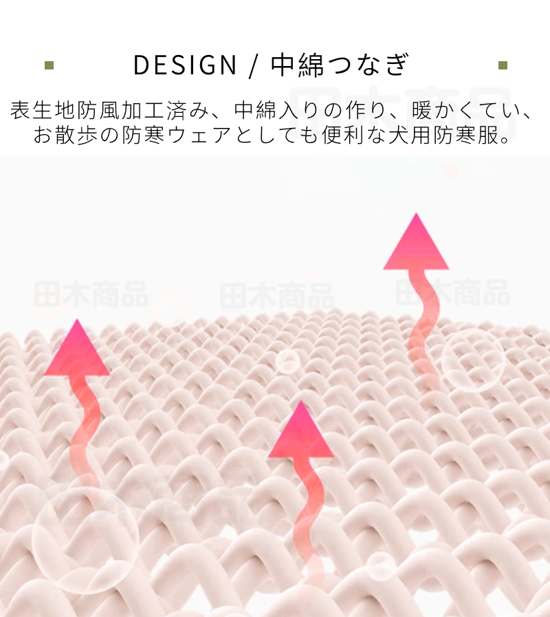 表生地防風加工済み、中綿入りの作り、暖かくて軽い、お散歩の防寒ウェアとしても便利な犬用防寒服。