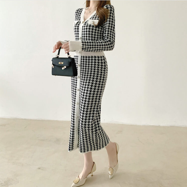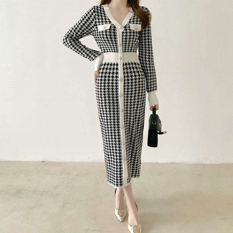 韓国デザインのエレガントな千鳥格子柄ニットワンピース。