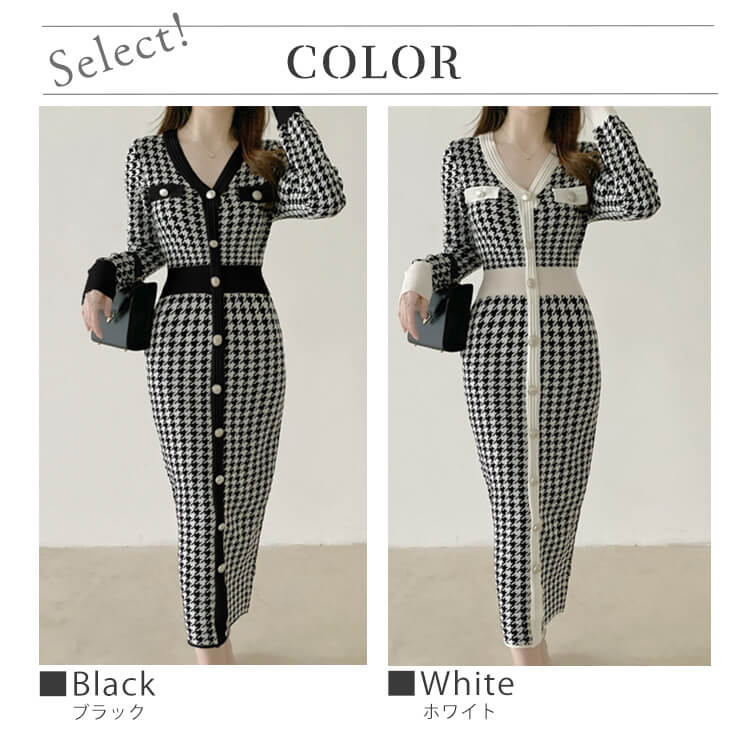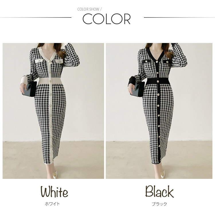 ワンピース レディース 韓国 ニットワンピース ニット 長袖 ミモレ丈 千鳥格子 フィット ストレッチ 着やせ 秋 Vネック 冬 秋冬 おしゃれ
