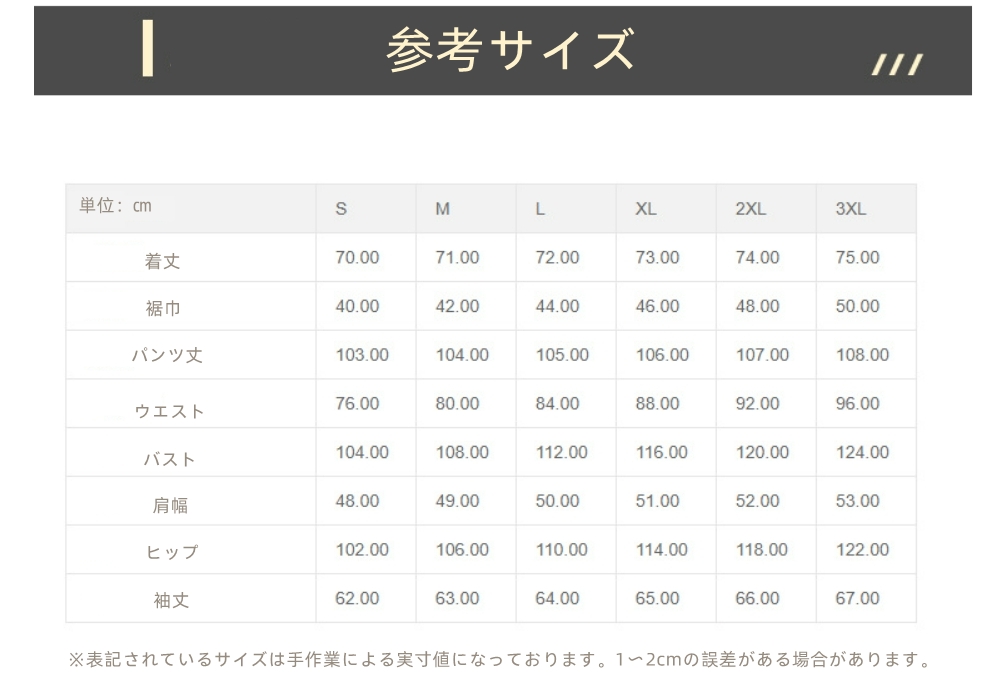 サイズ S M L XL 2XL 3XL