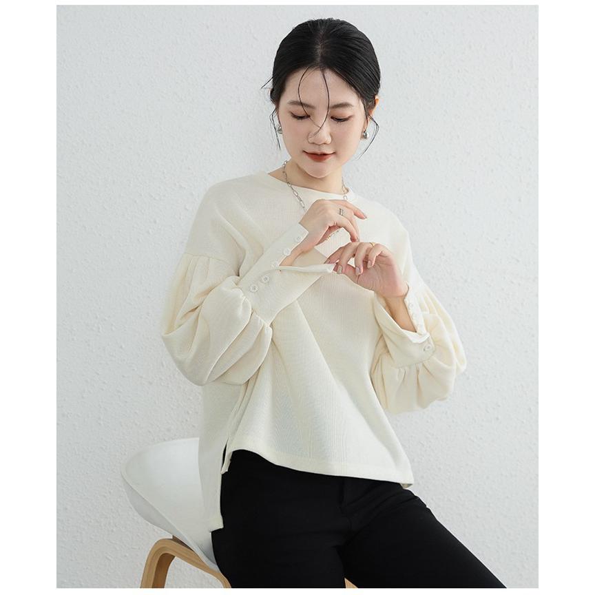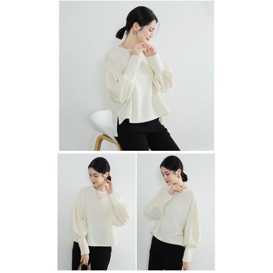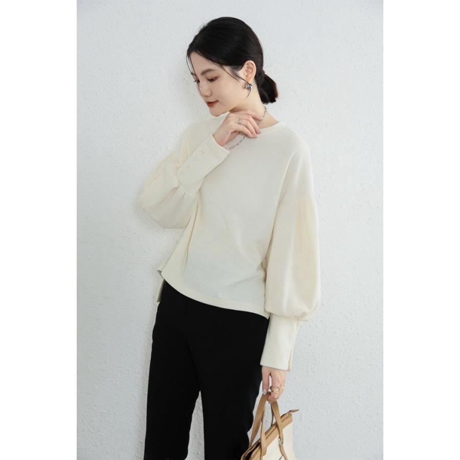 Tシャツ レディース 長袖 プルオーバー トップス 無地 柔らかい バルーン袖 クルーネック ゆったり カジュアル インナー 秋冬 シンプル 着〓せ 通勤 通学