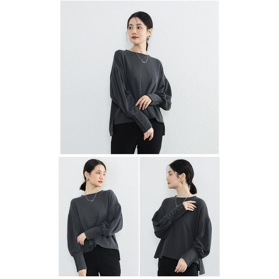 Tシャツ レディース 長袖 プルオーバー トップス 無地 カジュアル 秋冬 シンプル 柔らかい クルーネック インナー ゆったり バルーン袖