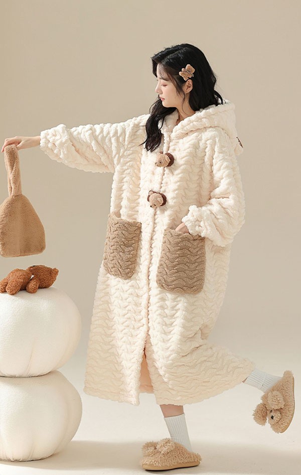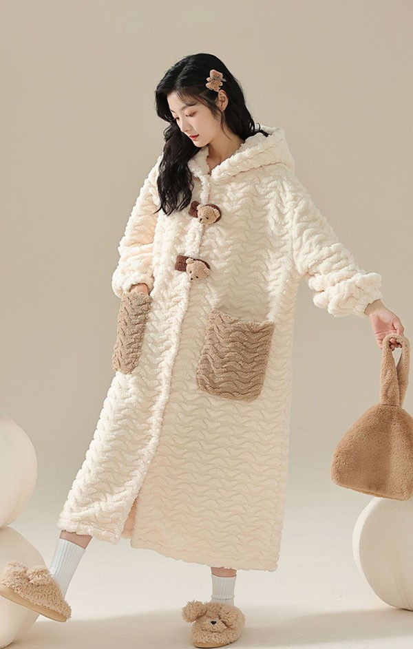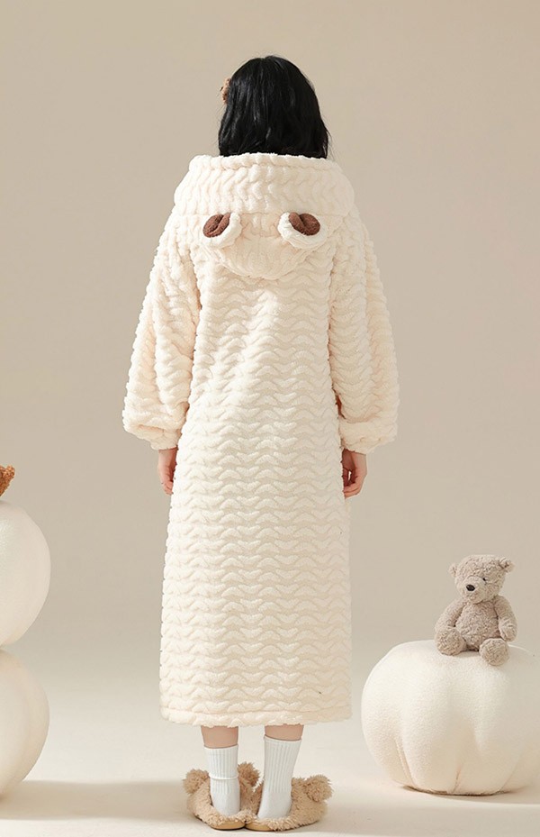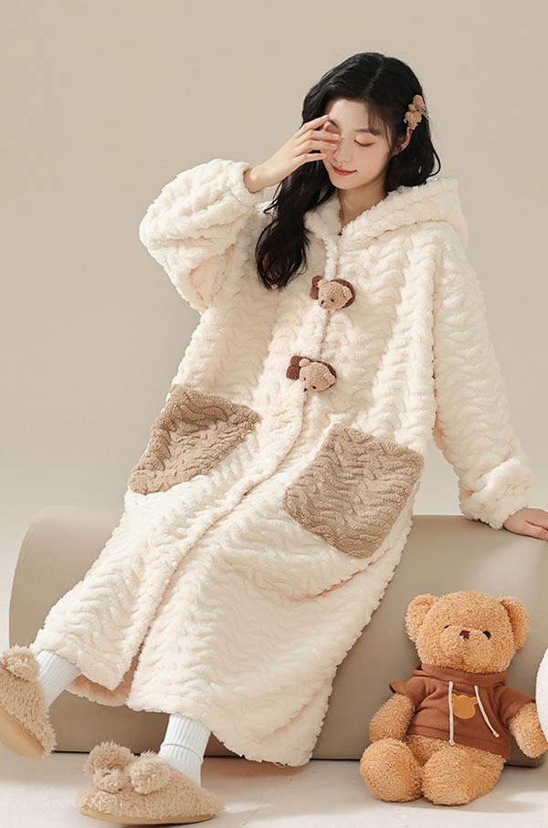 ルームウェア もこもこ 熊 パジャマ 冬 長袖 ナイトガウン 着る毛布 前開き フード付き 寝巻き 部屋着 暖かい あったか 。 モコモコ 大人用 ふわふわ 動物 レディース 女性用 ガウン かわいい 可愛い ギフト プレゼント N1M3