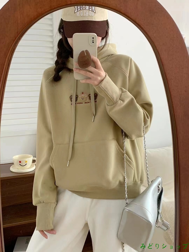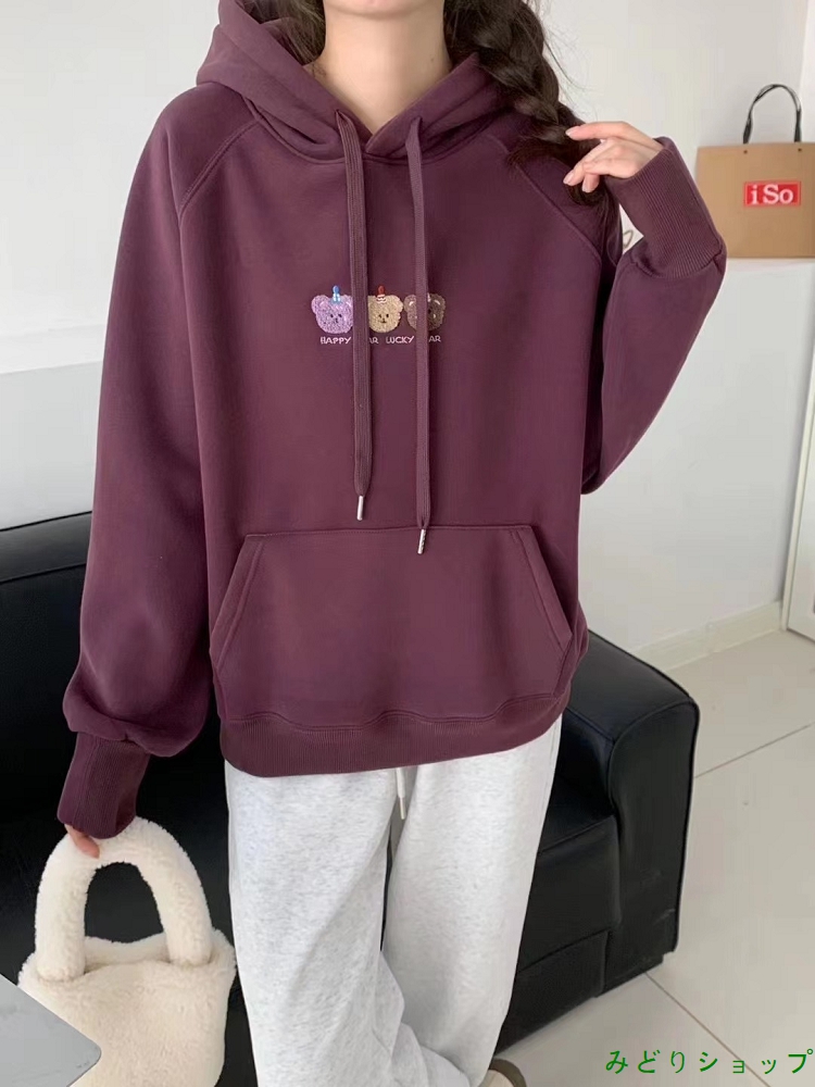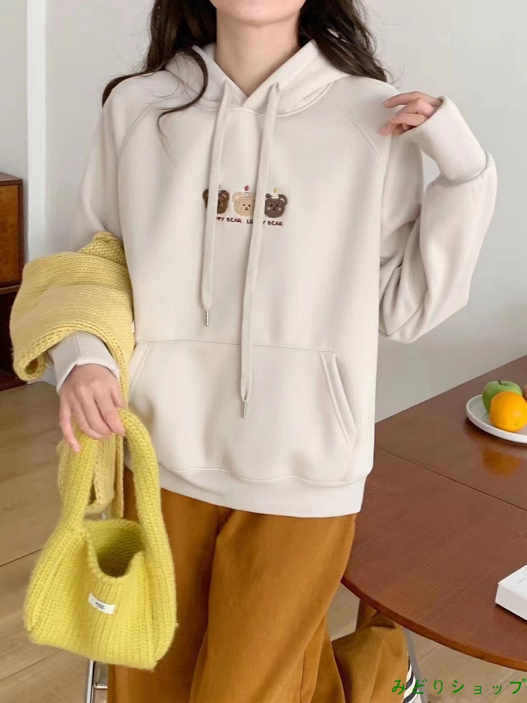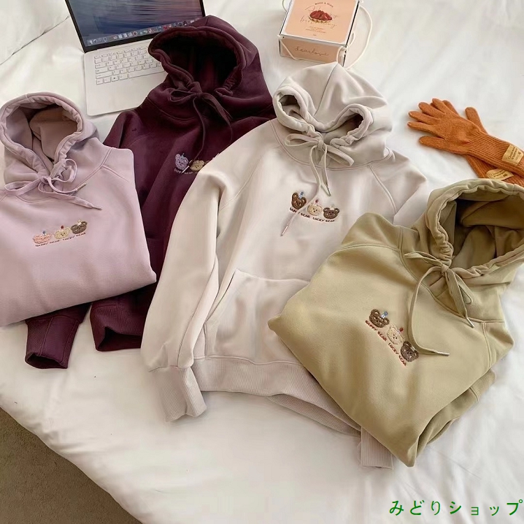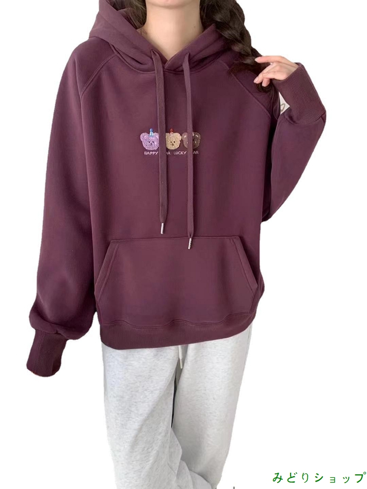 くまさん 刺繍 裏起毛 裏ボア フード付き トレーナー 秋冬