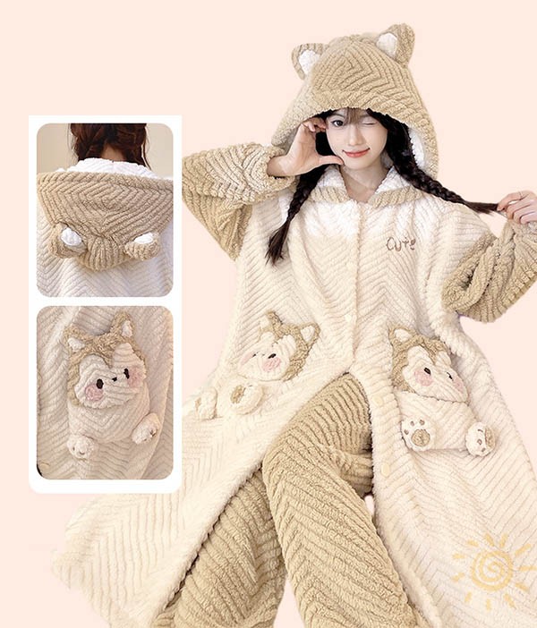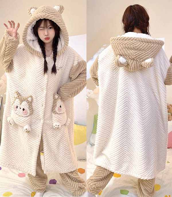 ルームウェア もこもこ リス パジャマ 冬 長袖 ナイトガウン 着る毛布 前開き フード付き 寝巻き 部屋着 暖かい あったか 。 モコモコ 大人用 ふわふわ 動物 レディース 女性用 ガウン かわいい 可愛い ギフト プレゼント N1M3