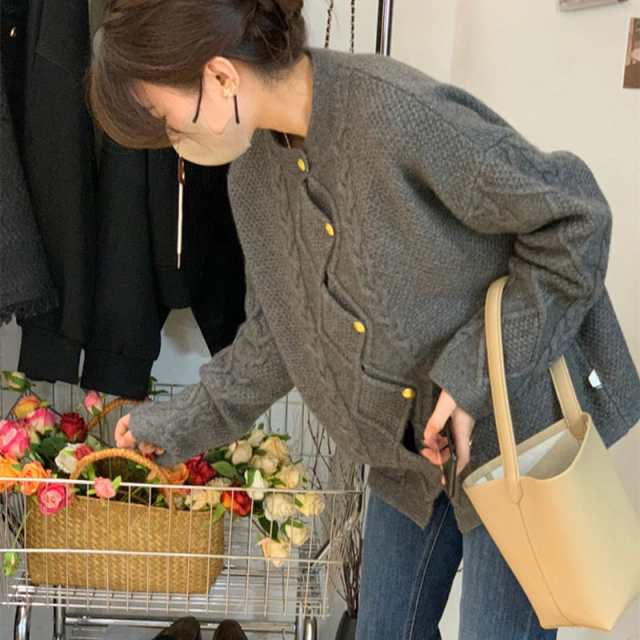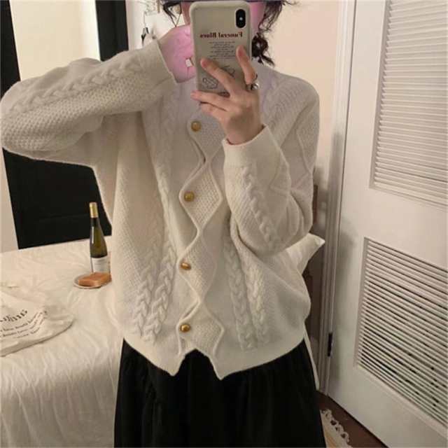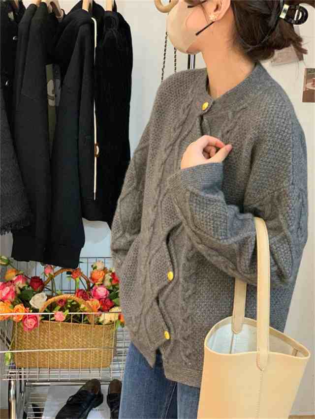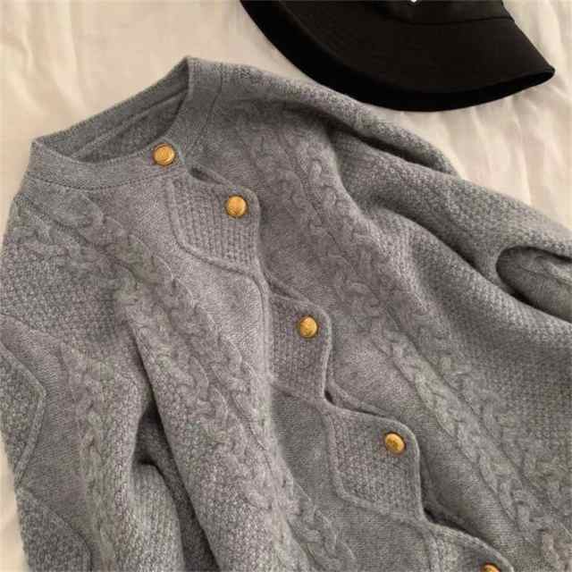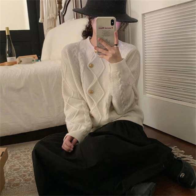 ニット カーディガン レディース トップス ジグザグ GOLDボタン レトロ クルーネック アウター ケーブルニット 羽織 秋冬 可愛い イレギュラー