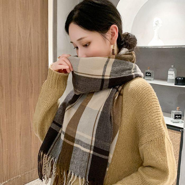 落ち着いた色合いと小さなフリンジで、肩からかけたり、首元に巻いたりと、コーディネートに添えるだけで、ぐっと大人な印象に。