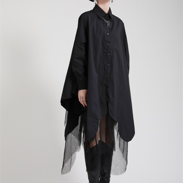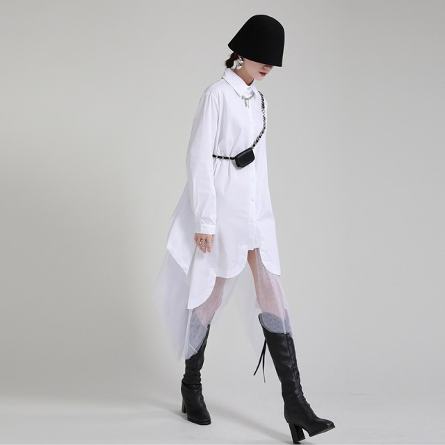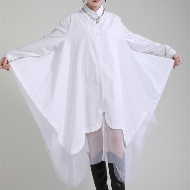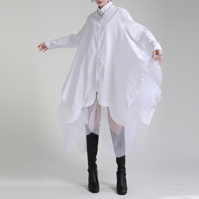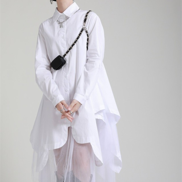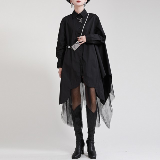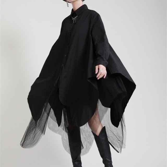 シャツワンピース アシンメトワンピース シャツ トップス レディース 長袖 変形デザイン ゴシック ブラウス 個性的 アシメ チュール モード系 不規則