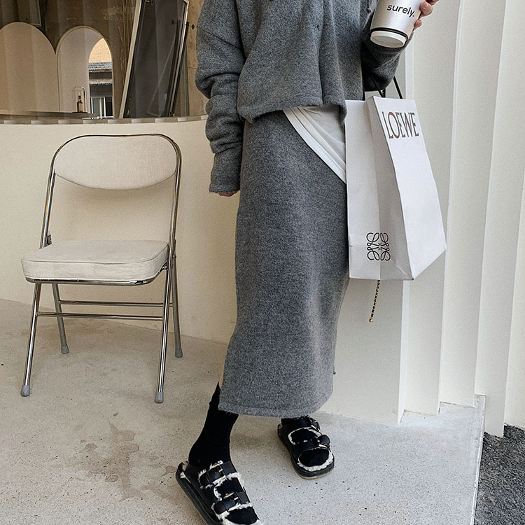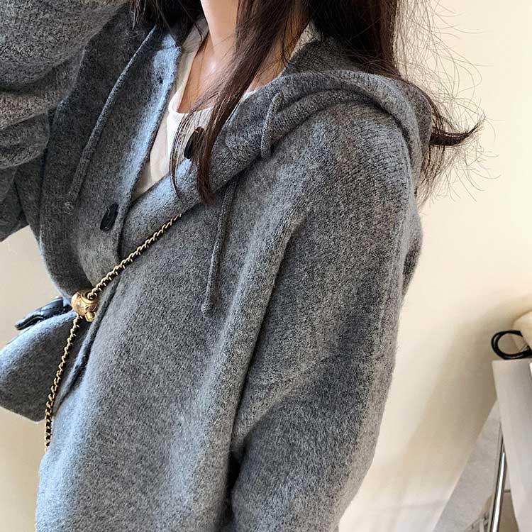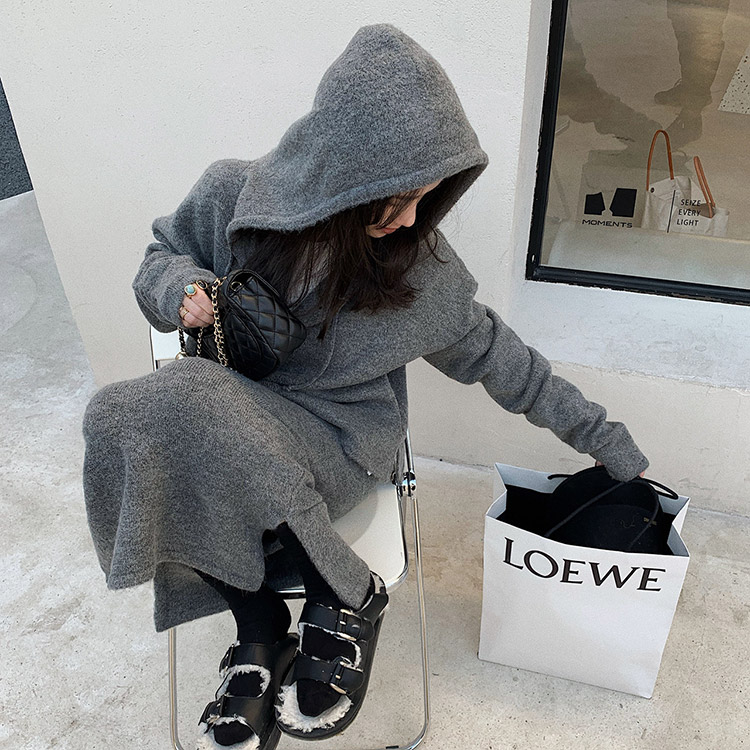 韓国デザインのフード付きカーディガン×ミモレ丈スカートのニットアップ。