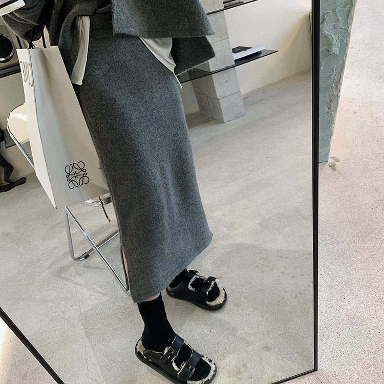シンプルなセミロング丈ハイウエストスカートは、てろんとしたニット素材に裾スリットを入れ、シンプルなデザインながらナチュラルできれいめの雰囲気に。