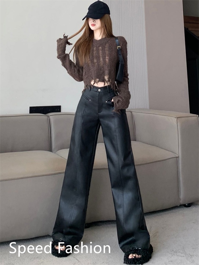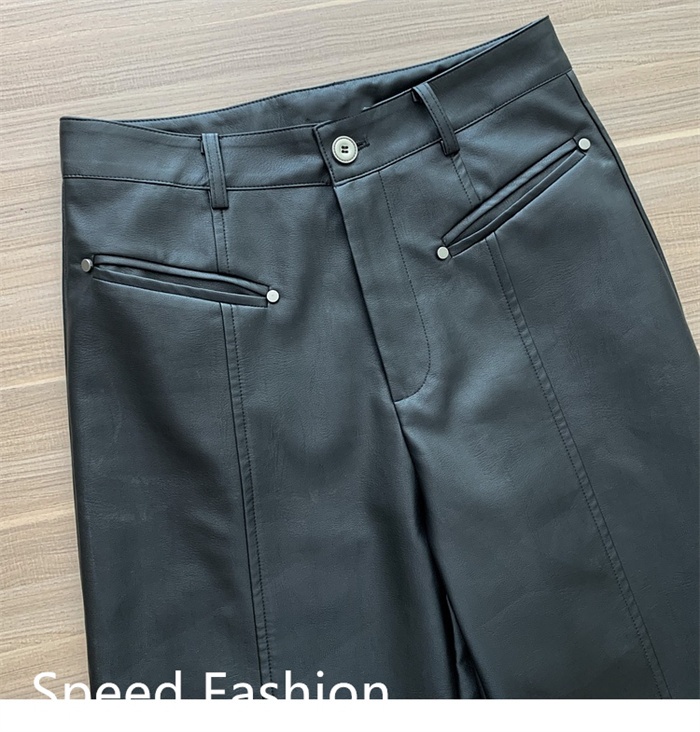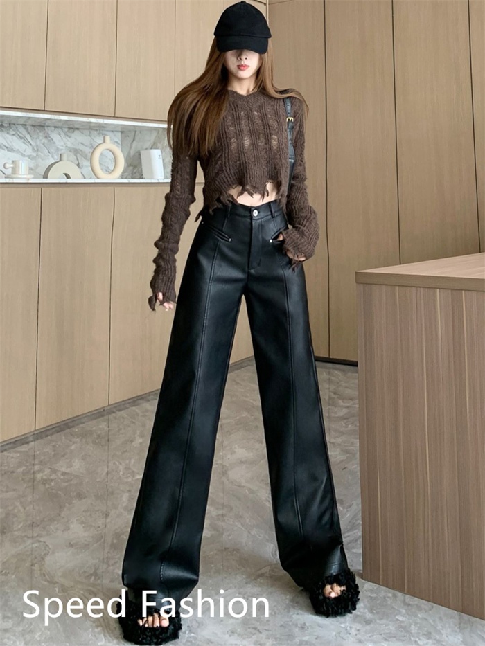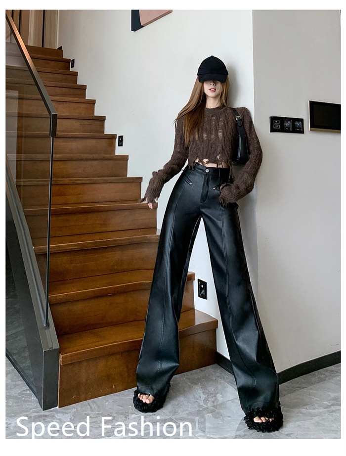 全体的にゆったりとしたシルエットのストレートレザーは、華奢見せ効果も。