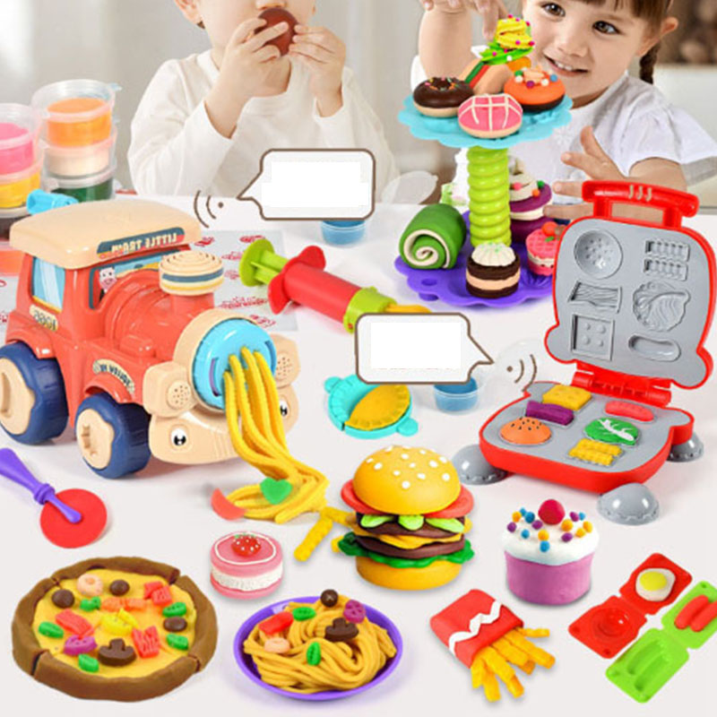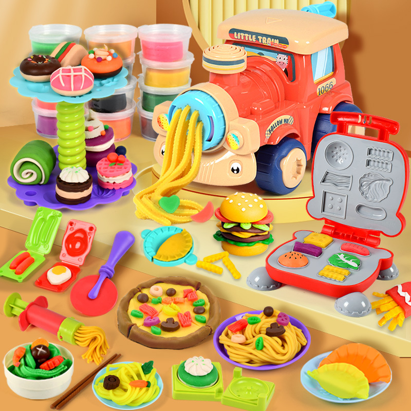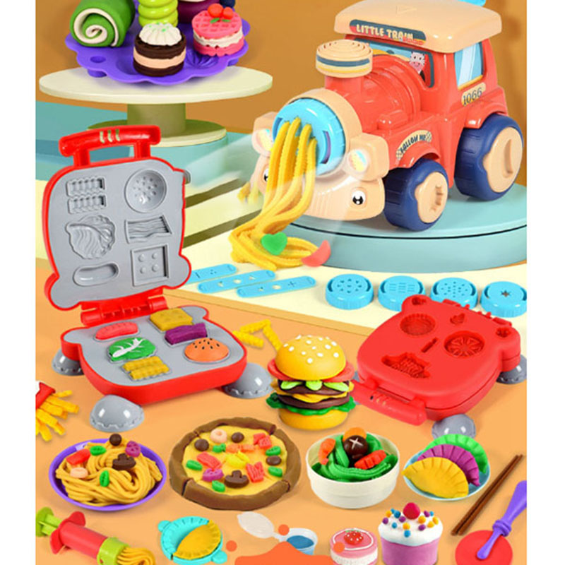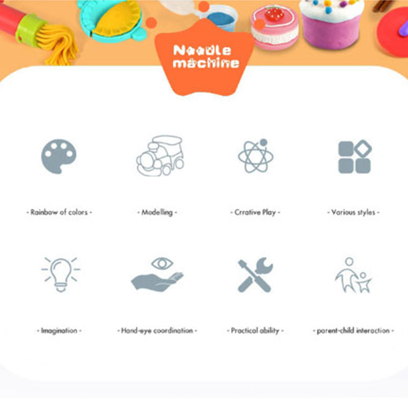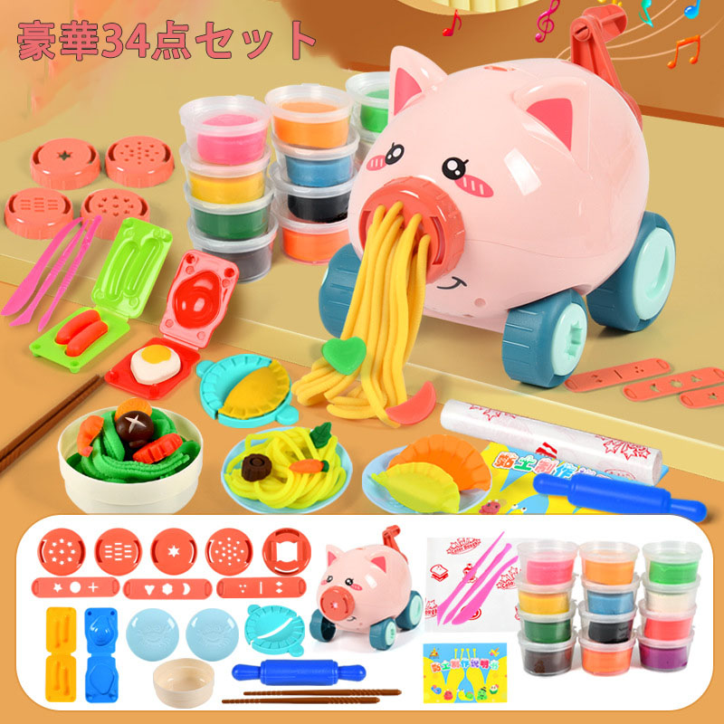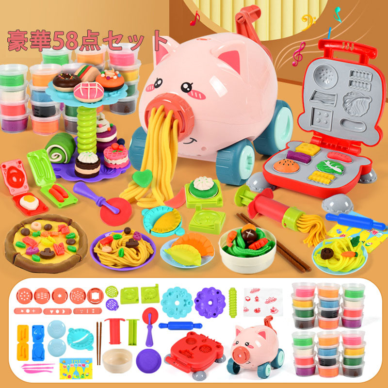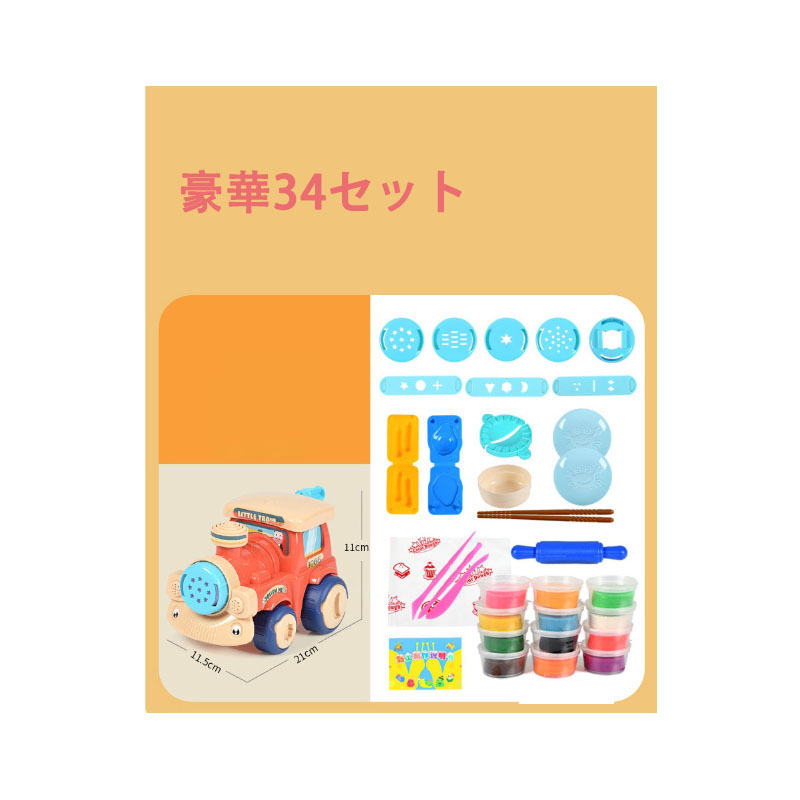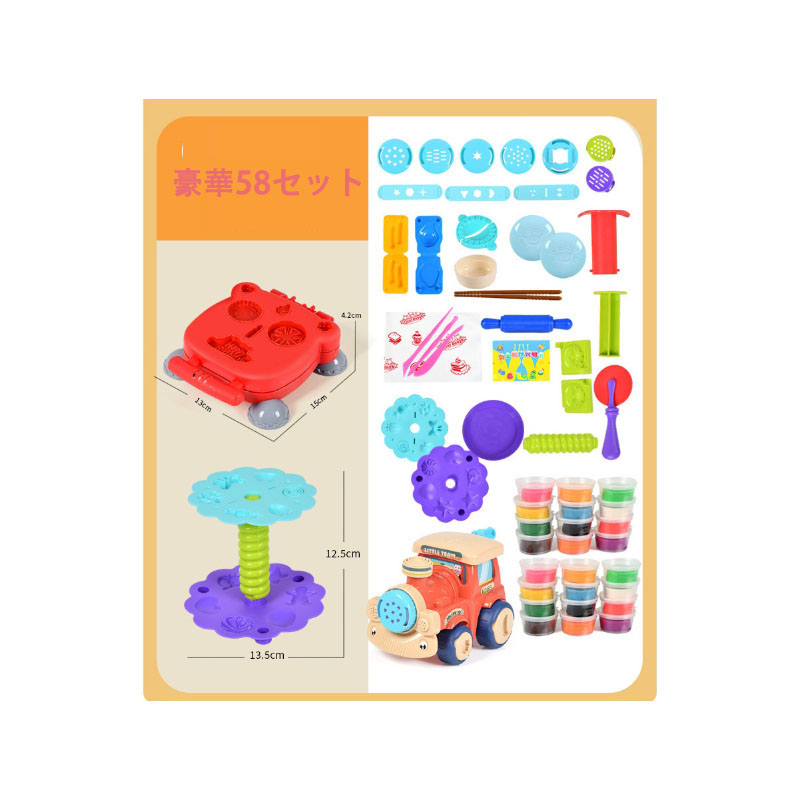 超豪華セット:12色粘土・ローラー・押し型・ソフトクリームメーカー・ハンバーガーメーカー・製麺機など様々な道具がつています!粘土でいろんな形を作れるのが魅力的です?こねたり、へらできったりして、手先の器用さを役立ちます!