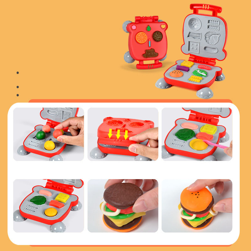 粘土でハンバーガーを作れる:一つの部品で、ハンバーガーのバンズ・チーズ・ハンバーグ・ソーセージを型押しで同時に作れます??完成したねんどハンバーガーをお皿に盛りつけて、ごっこ遊びに大活躍してくれます。