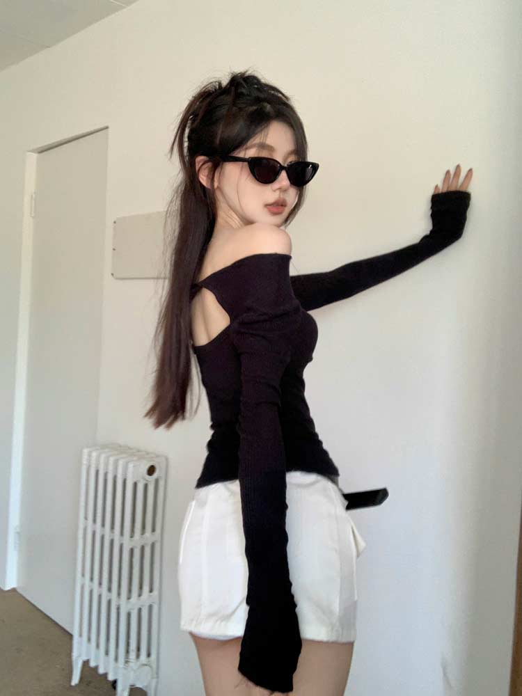 胸元セクシートップス レディース長袖Tシャツ シンプル セクシートップス ブラック レディースファッション